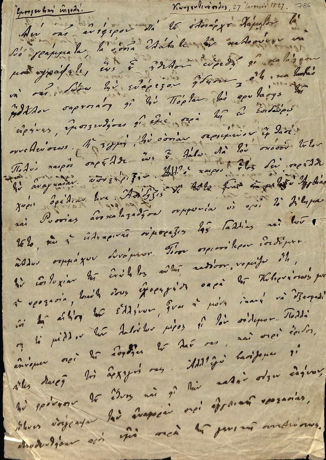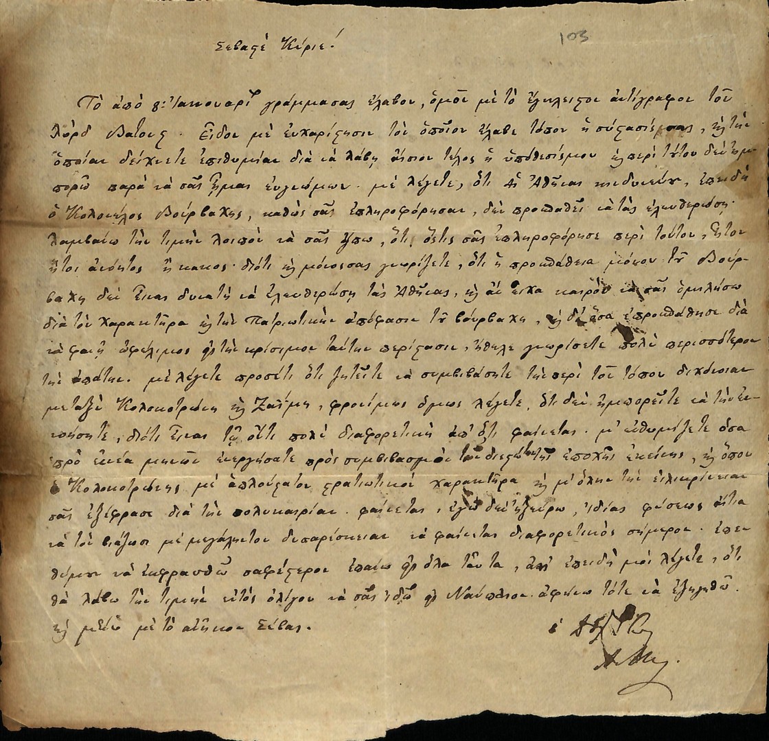 Επιστολη Στρατφορδ Κανινγκ προς Θεοδωρο Κολοκοτρωνη - αναφορικα με την συμφωνια Αγγλιας-Ρωσιας για την επιλυση του Ελληνικου ζητηματος οπως και των αλλων συμμαχικων δυναμεων