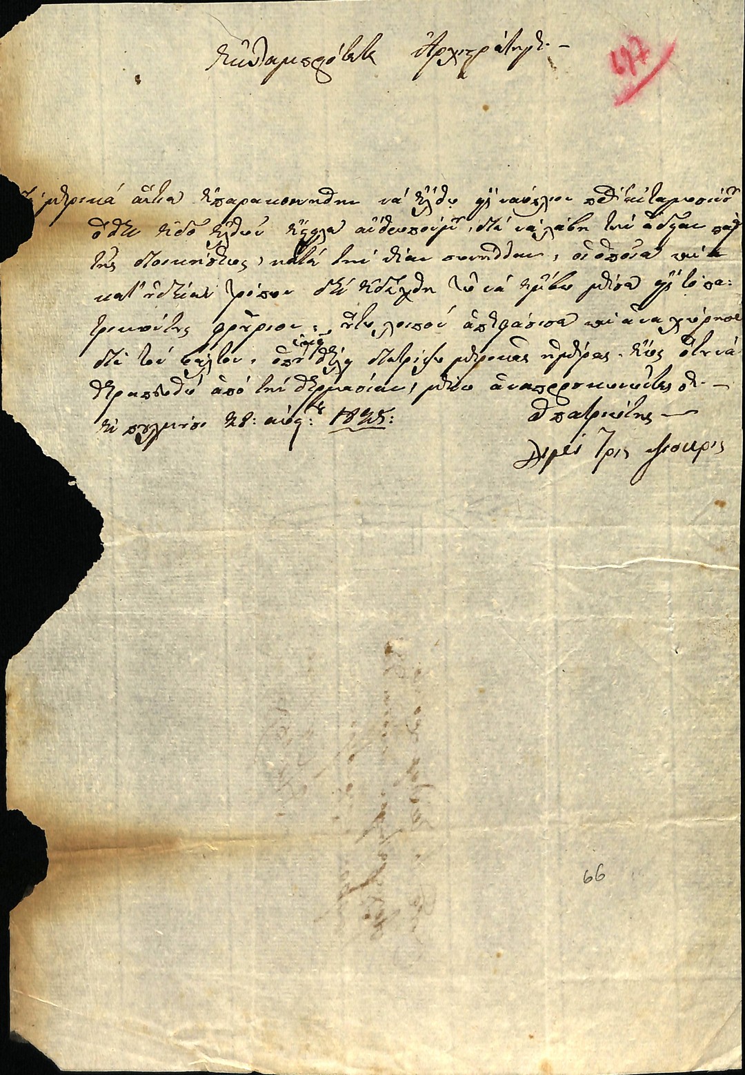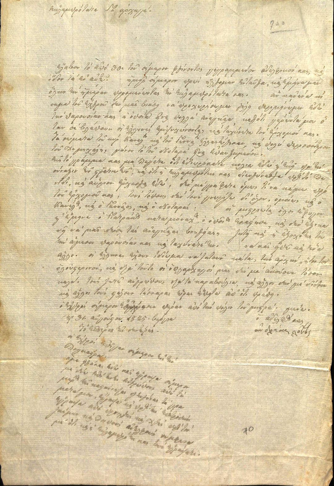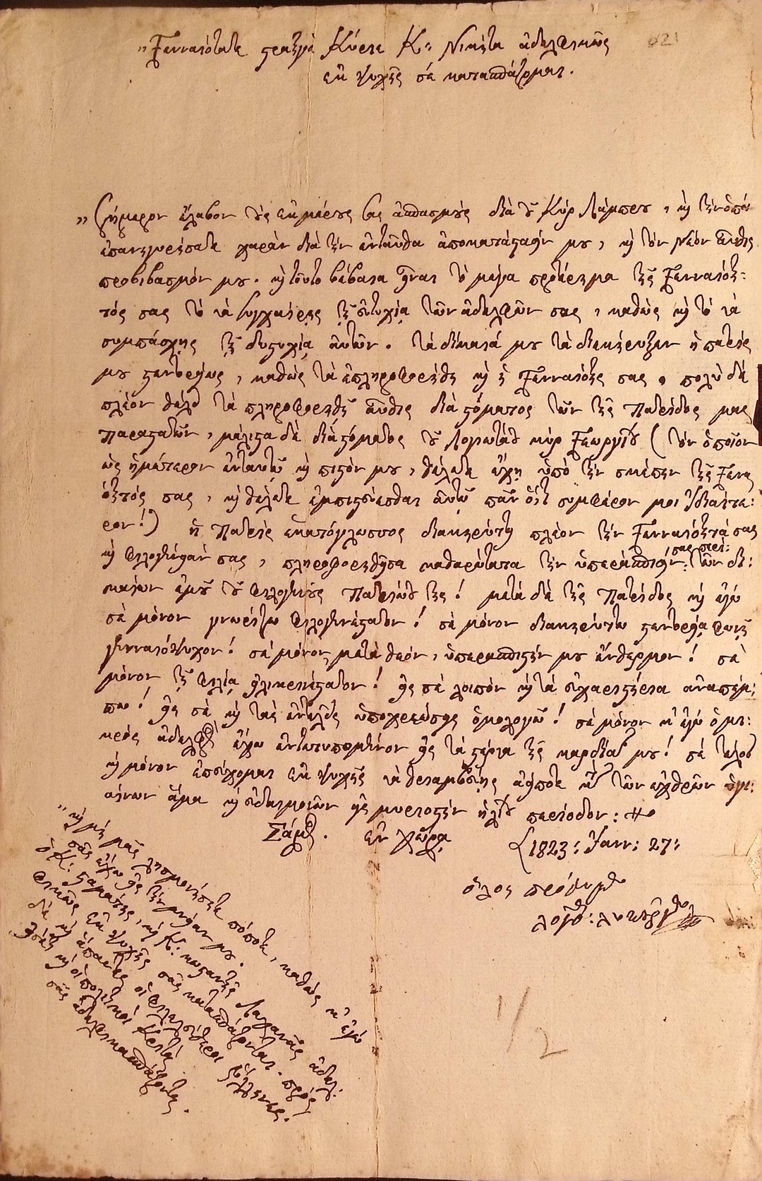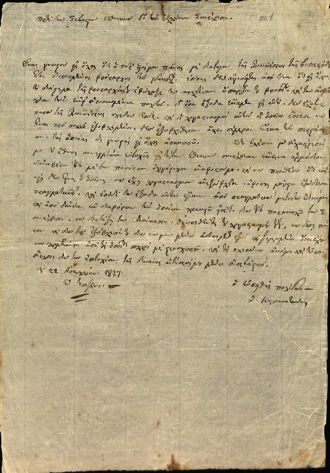 | Τίτλος | Επιστολή Π.Δ.Ε, του Υπουργού Πολέμου προς Στρατηγό Θεόδωρο Κολοκοτρώνη για ζητήματα του εφοδιασμού στρατοπέδου Νεοκάστρου |