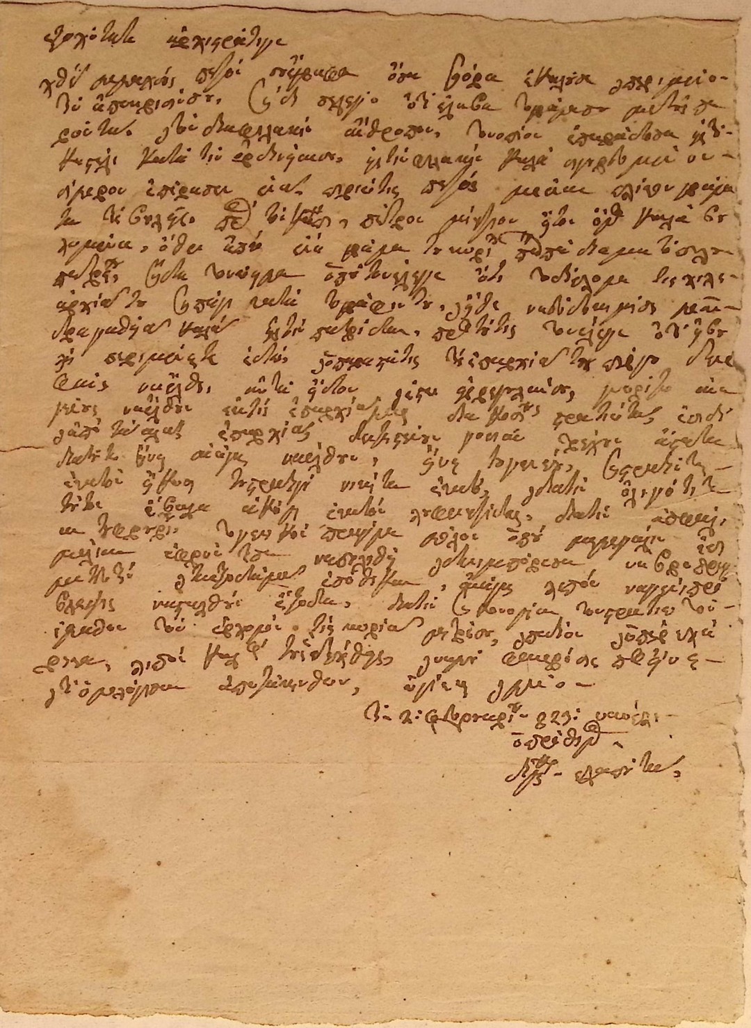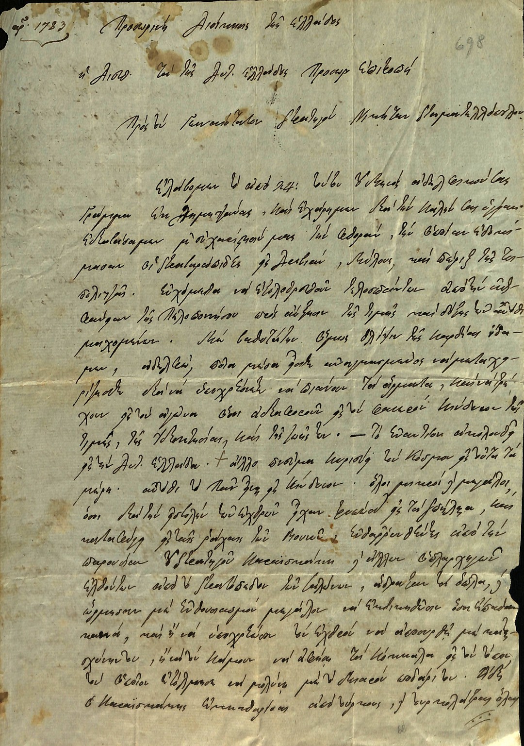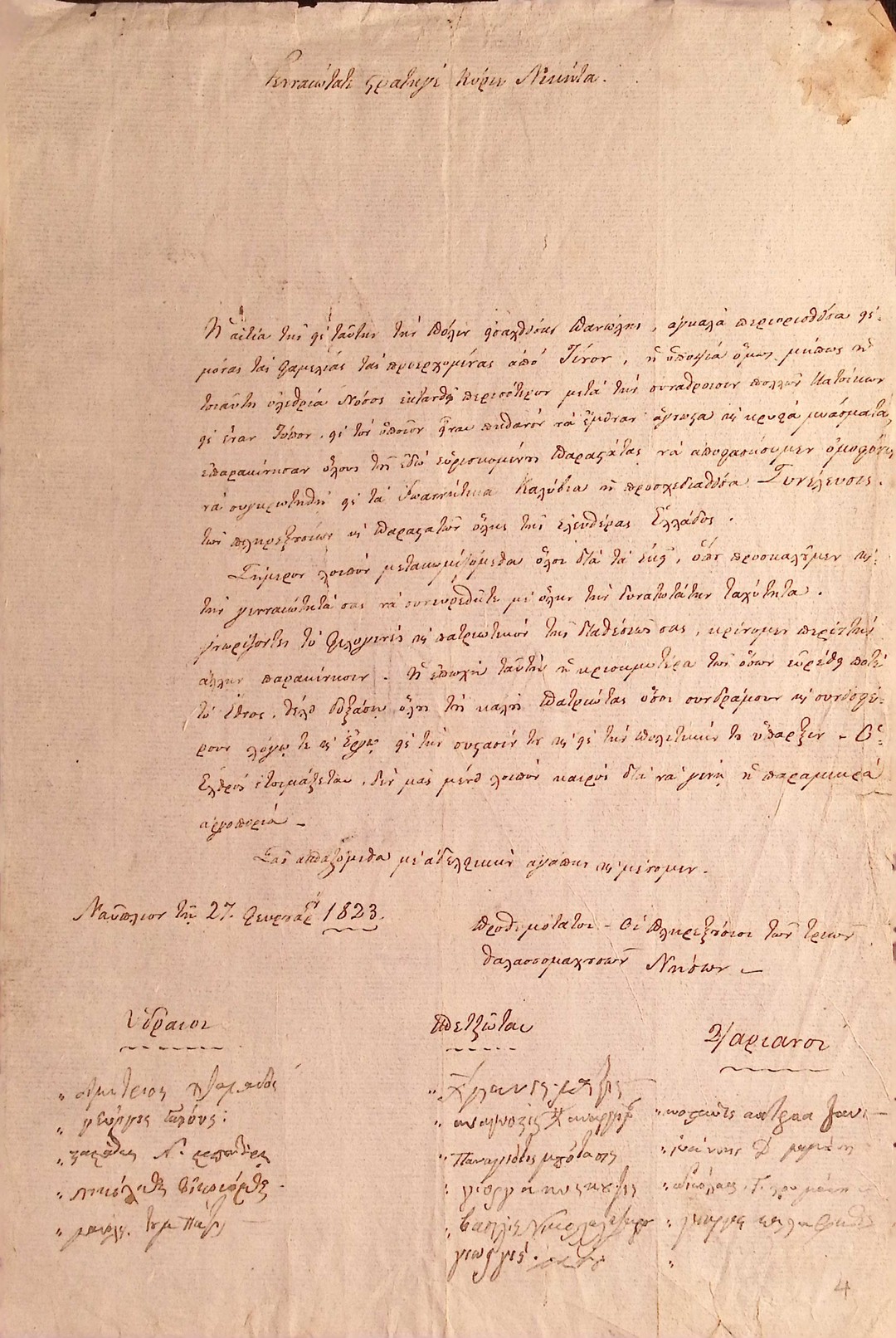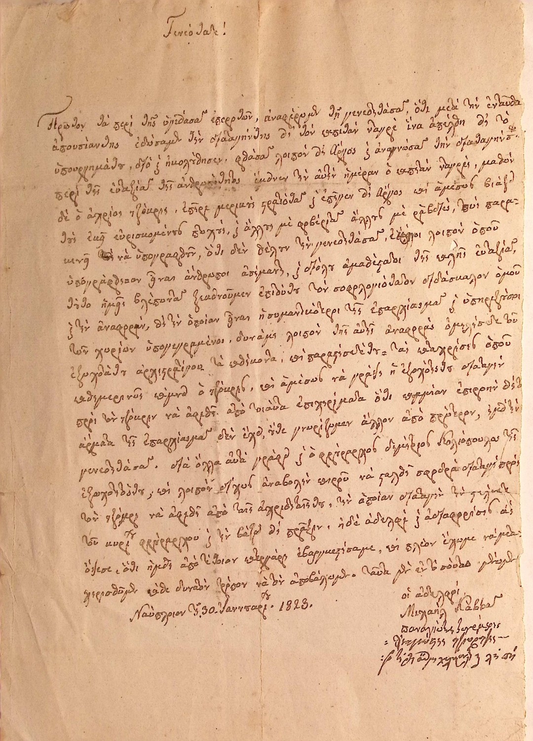 | Τίτλος | Επιστολή Πληρεξουσίων Ύδρας, Σπετσών και Ψαρών προς τον Στρατηγό Νικήτα Σταματελόπουλου (Νικηταρά) για την ενημέρωση επιδημίας πανώλης και αλλαγής του τόπου της Εθνικής Συνέλευσης |