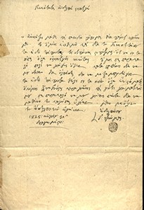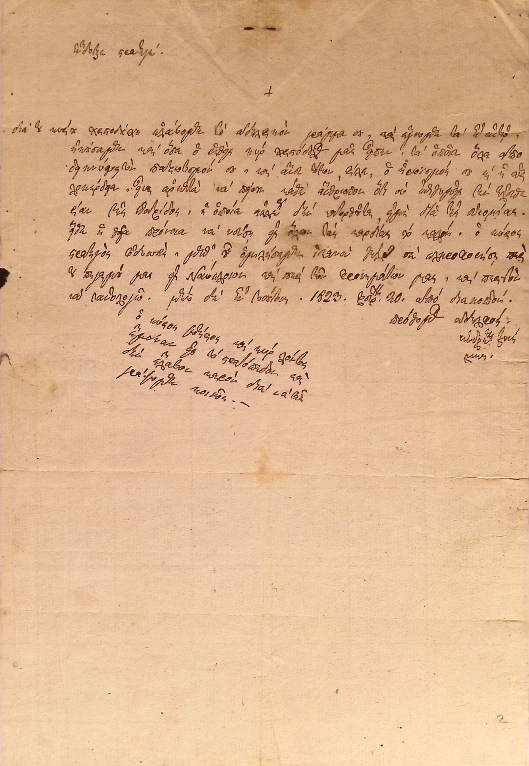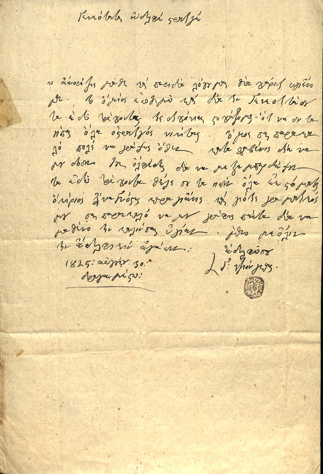 | Τίτλος | Επιστολη Ανδρεα Λοντου προς Θεοδωρο Κολοκοτρωνη αναφορικα με αφιξη του στα Βερβενα προς εμψυχωση των στρατιωτων μετα τα προσφατα γεγονοτα. |