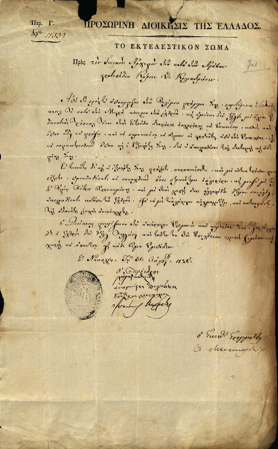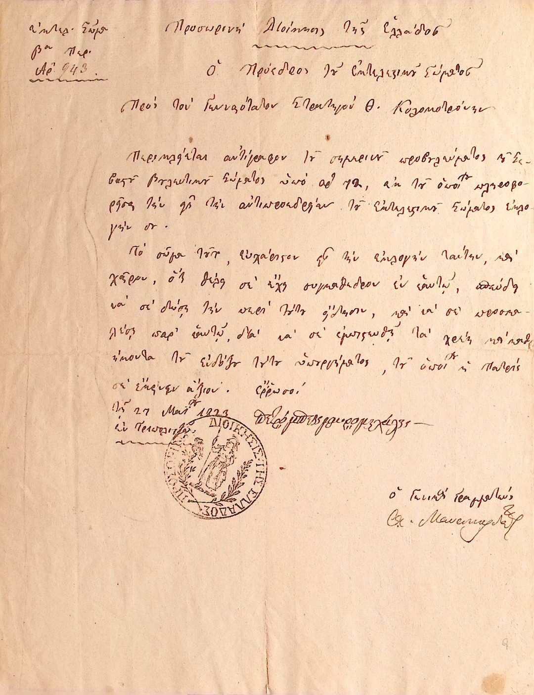 | Τίτλος | Επιστολή Προέδρου Εκτελεστικού προς τον Θεόδωρο Κολοκοτρώνη για την εκλογή του στη θέση Αντιπροέδρου του Έκτελεστικου |