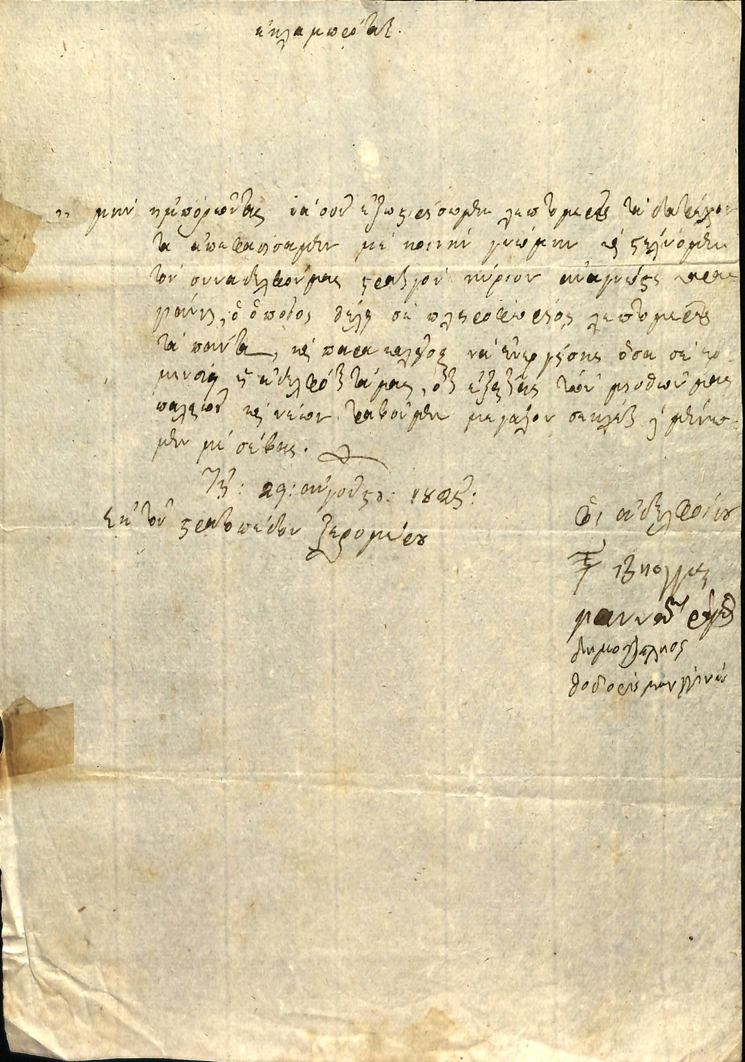 | Τίτλος | Επιστολη Εκτελεστικου προς Θεοδωρο Κολοκοτρωνη αναφορικα με επιθεση του εχθρου στο Μιστρα και εκκινησης στρατευματων προς ενισχυση του |