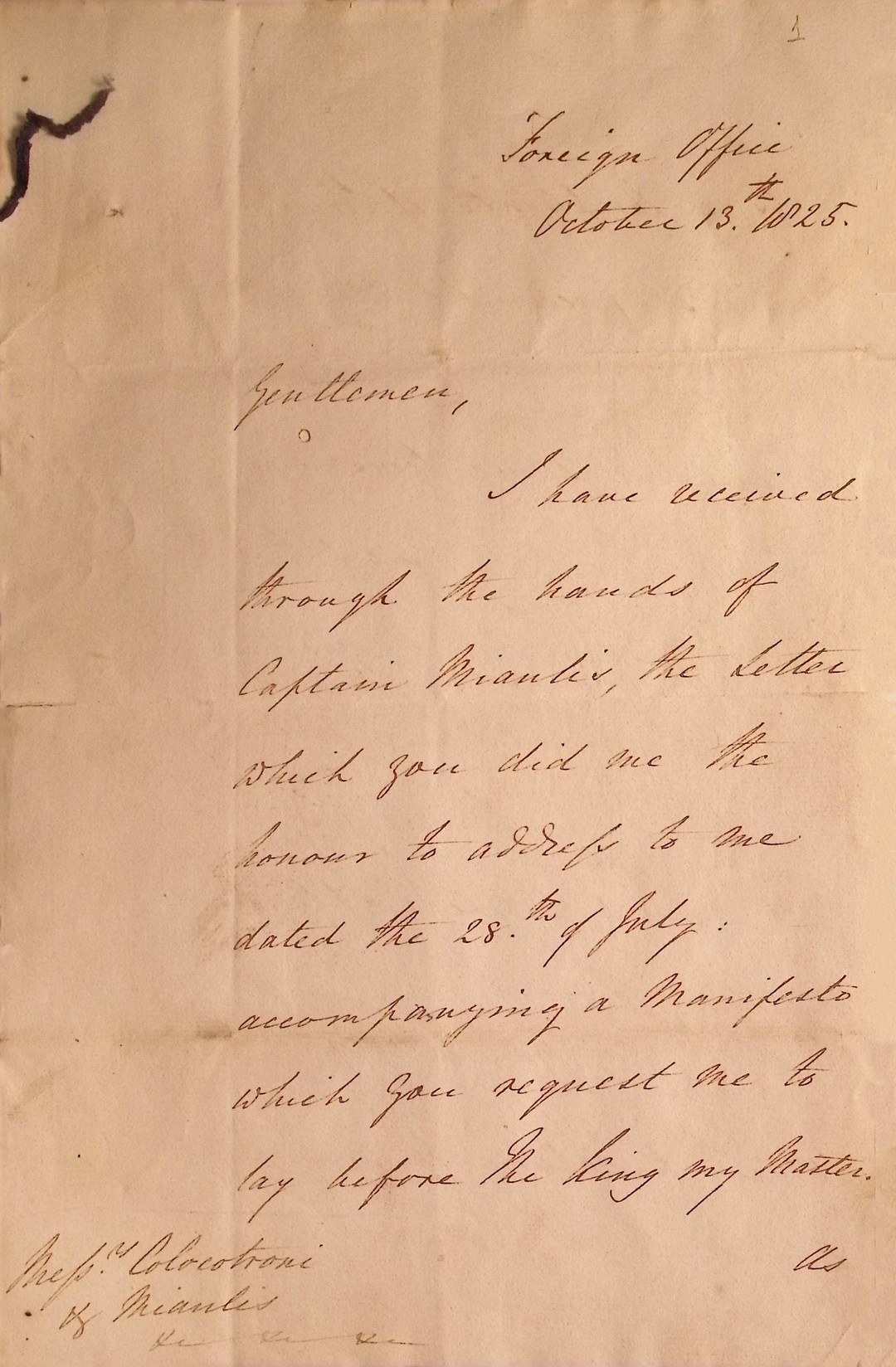 | Τίτλος | Επιστολή προς Θ.Κολοκοτρωνη και Α.Μιαουλη απο τον Υπουργό Των Εξωτερικών της Αγγλίας Γεώργιο Κάνιγκ. |