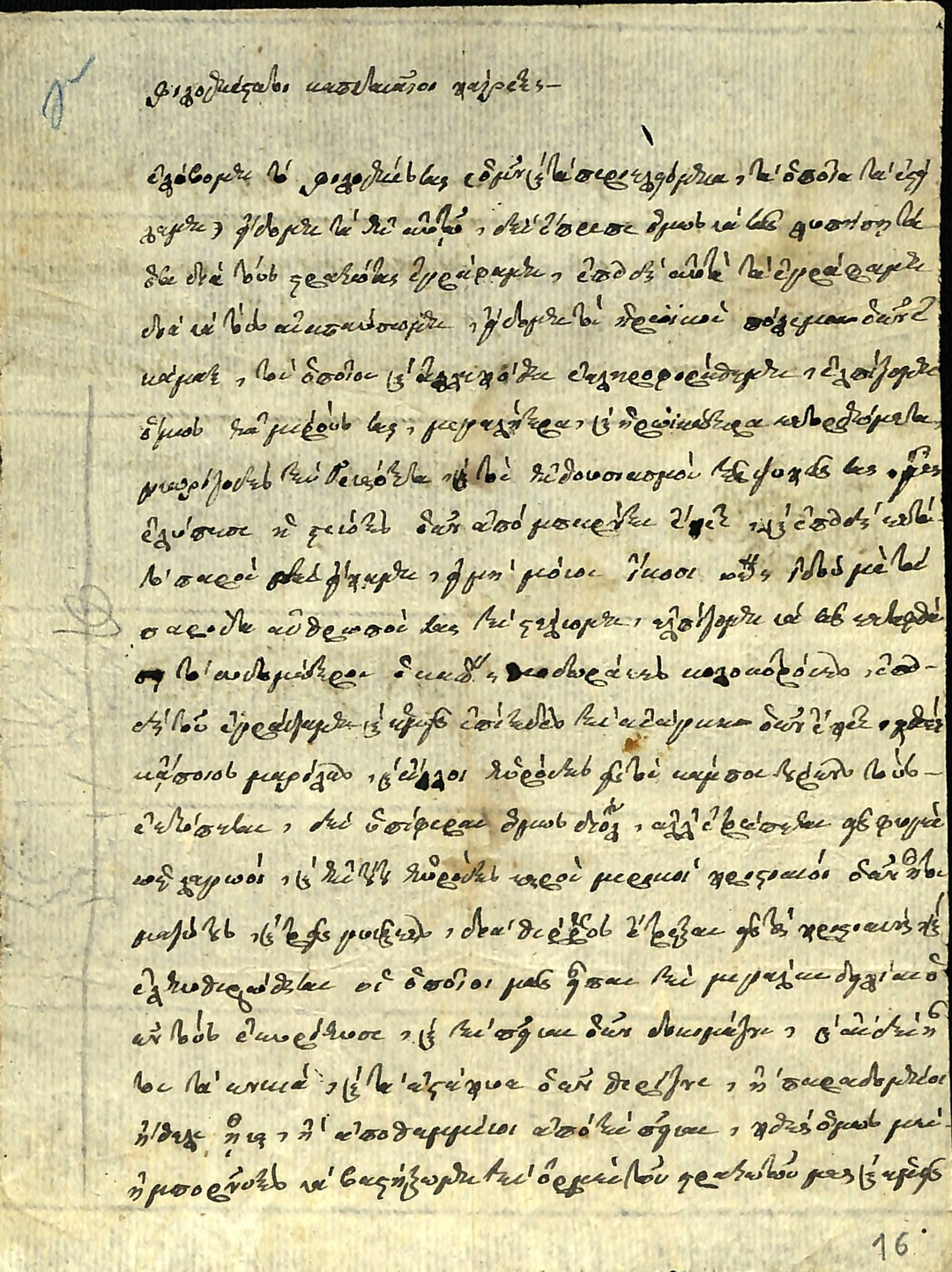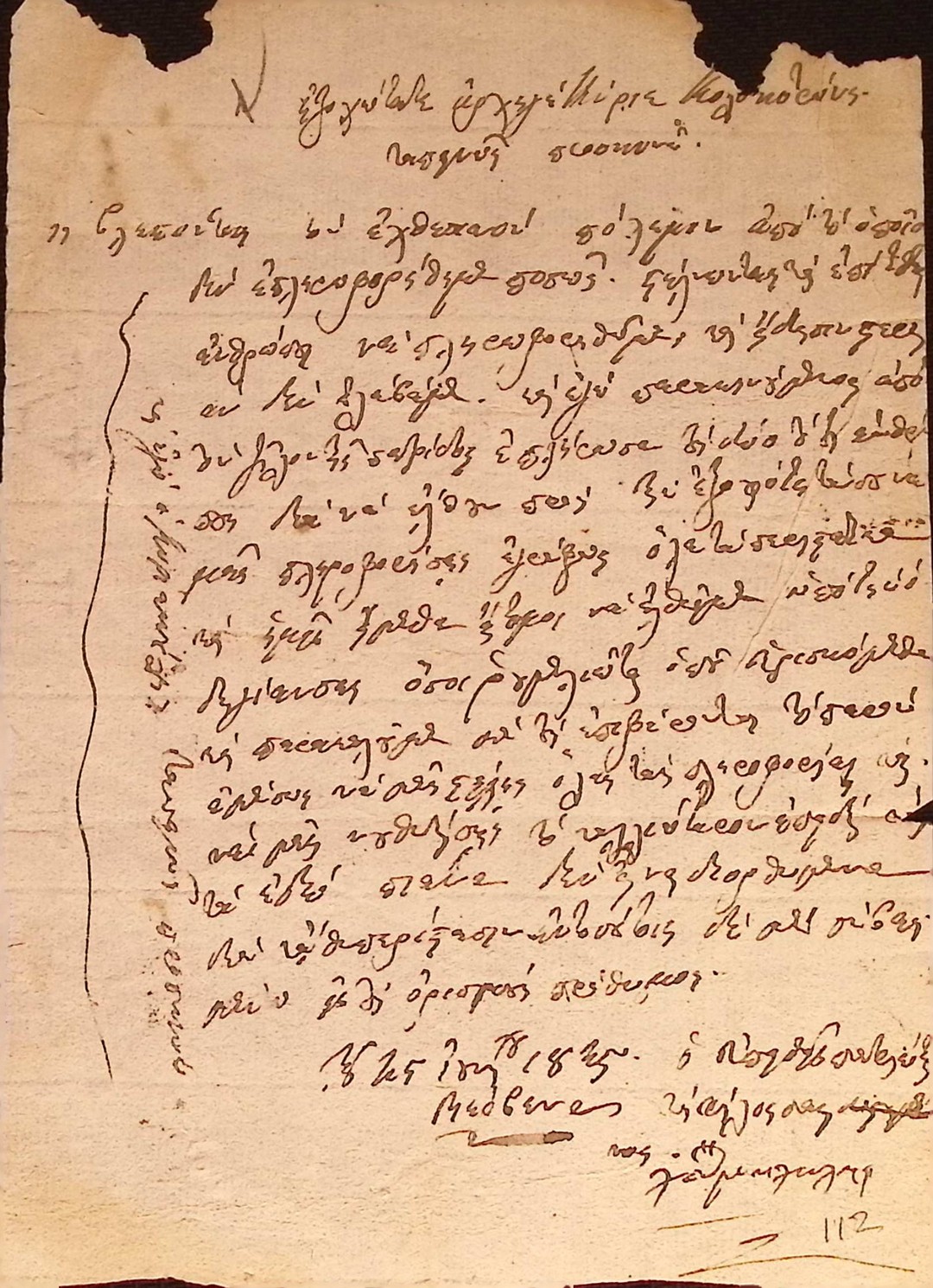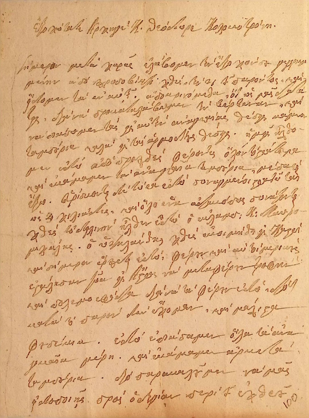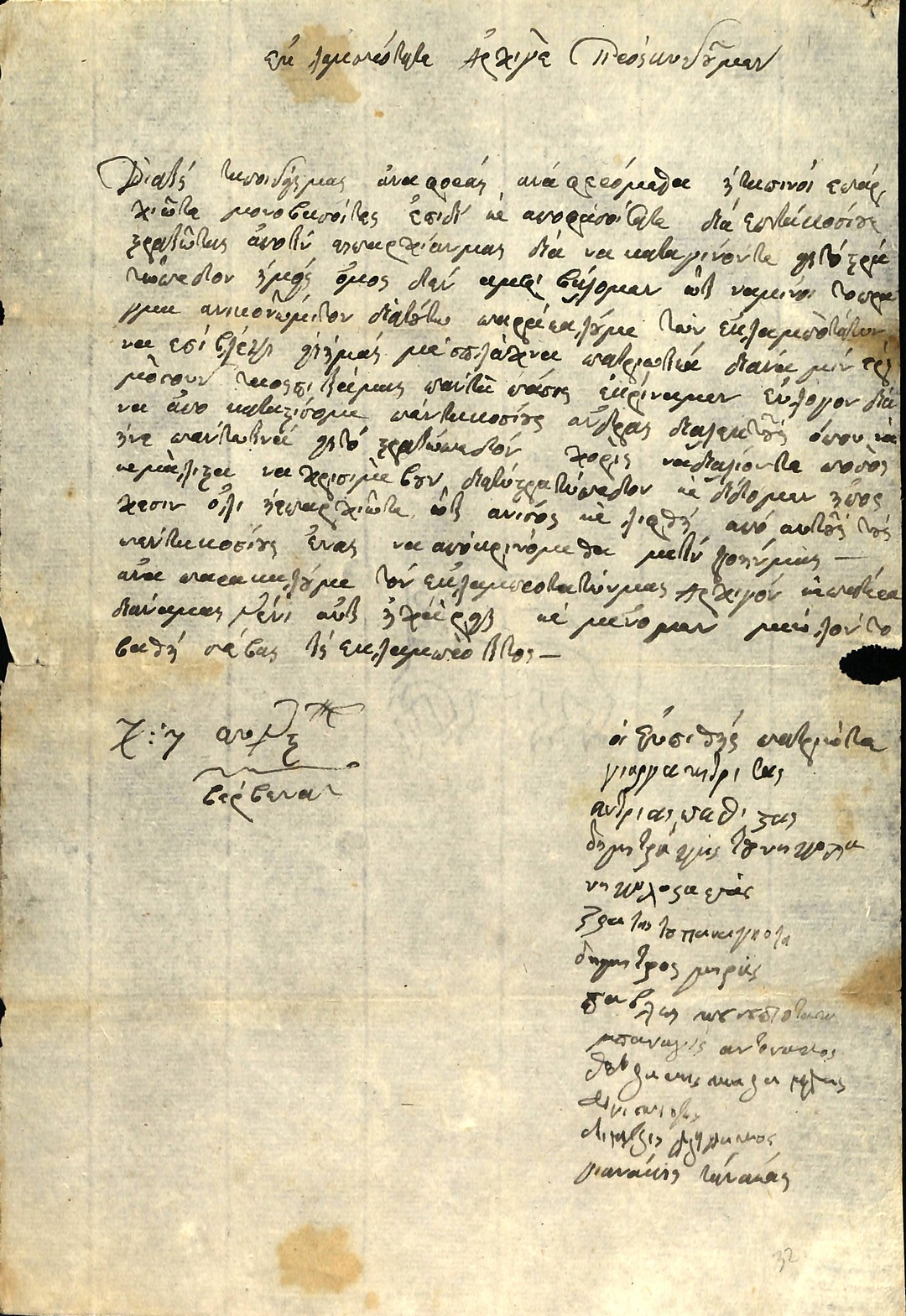 | Τίτλος | Επιστολή Επισκόπου Έλους Λακωνίας, Άνθιμου κ.α. προς τους πολιορκούντες το Ναύπλιο Νικηταρά, Τζώκρη, Κρέστα και Σταικόπουλο με ενημέρωση συμβάντων και αίτημα παροχής πολεμοφοδίων. |