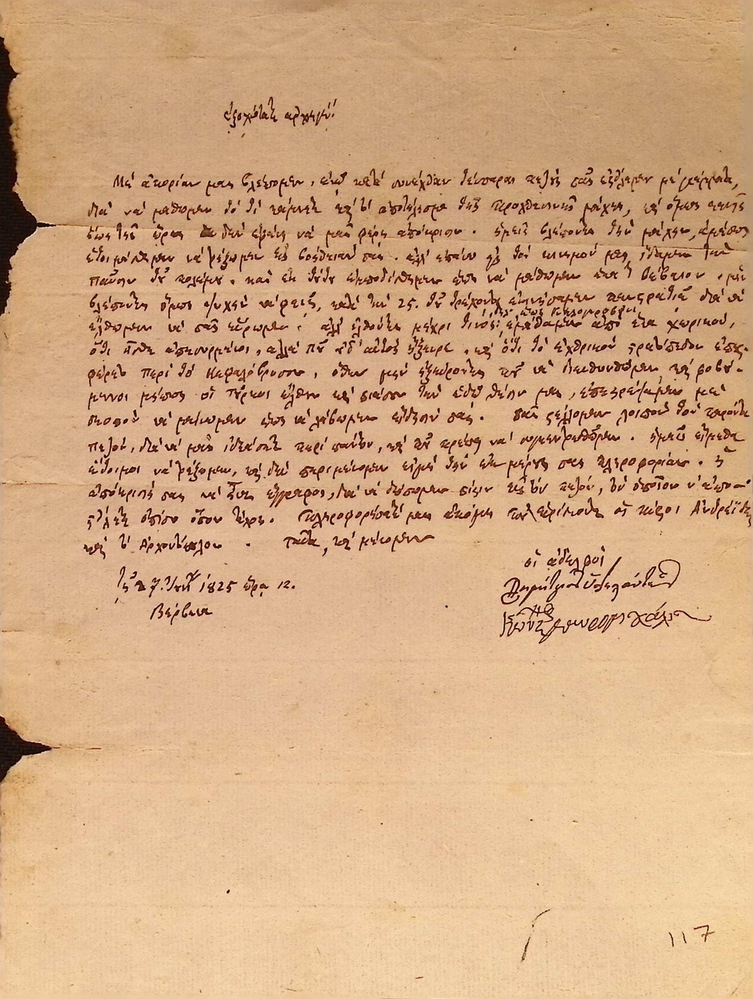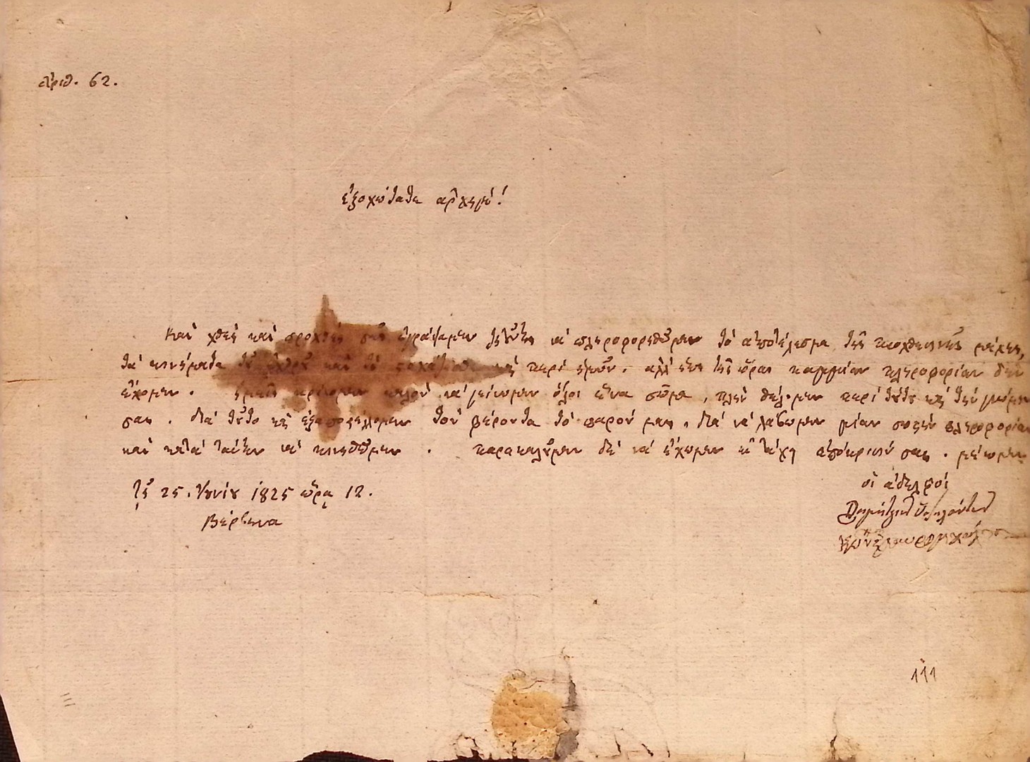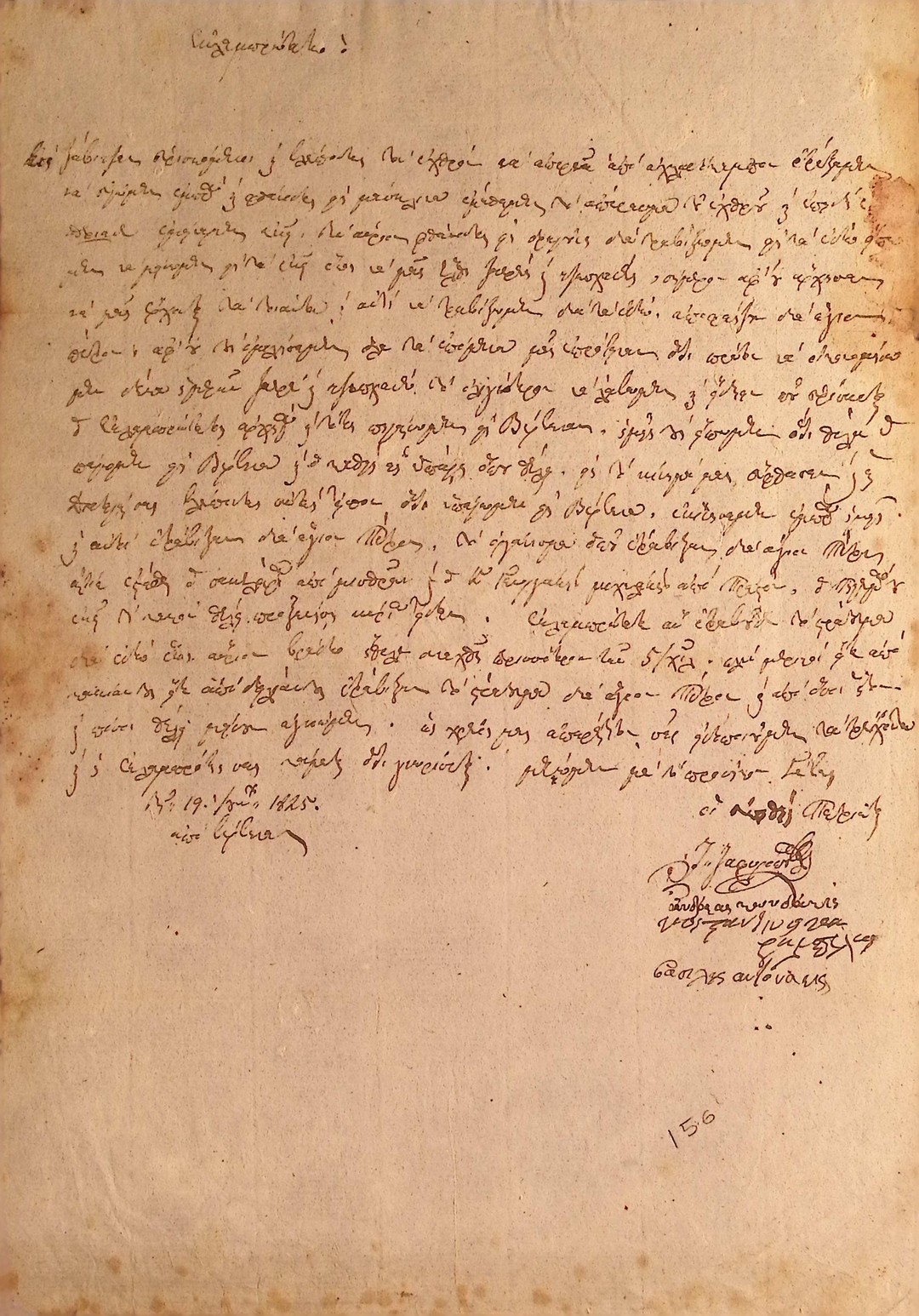 | Τίτλος | Επιστολή Γιωργάκη Μιχαλάκη κ.α οπλαρχηγών προς Θεόδωρο Κολοκοτρώνη με πληροφορίες για κίνηση στρατευμάτων και αίτημα για νέες οδηγίες - διαταγές |