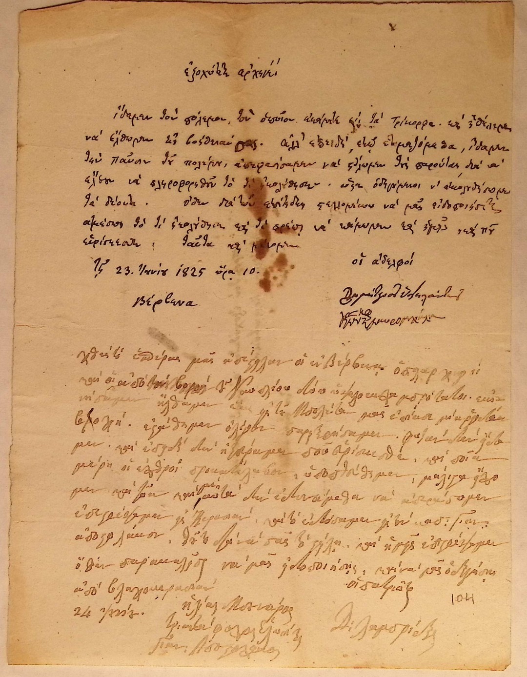 | Τίτλος | Επιστολή αδελφών Ζαχαρόπουλων προς Θεόδωρο Κολοκοτρώνη με πληροφορίες για κίνηση στρατευμάτων και αίτημα για νέες οδηγίες - διαταγές |