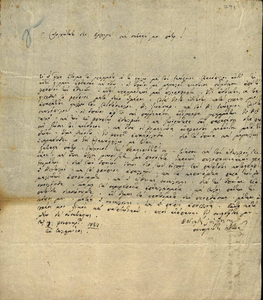 | Τίτλος | Επιστολη Παναγιωτη Νοταρα προς Θεοδωρο Κολοκοτρωνη - αναφορικα με την δεινη κατασταση της Ακροπολεως και την αιτηση αμεσης αποστολης στρατευματων απο την Πελοποννησο |
