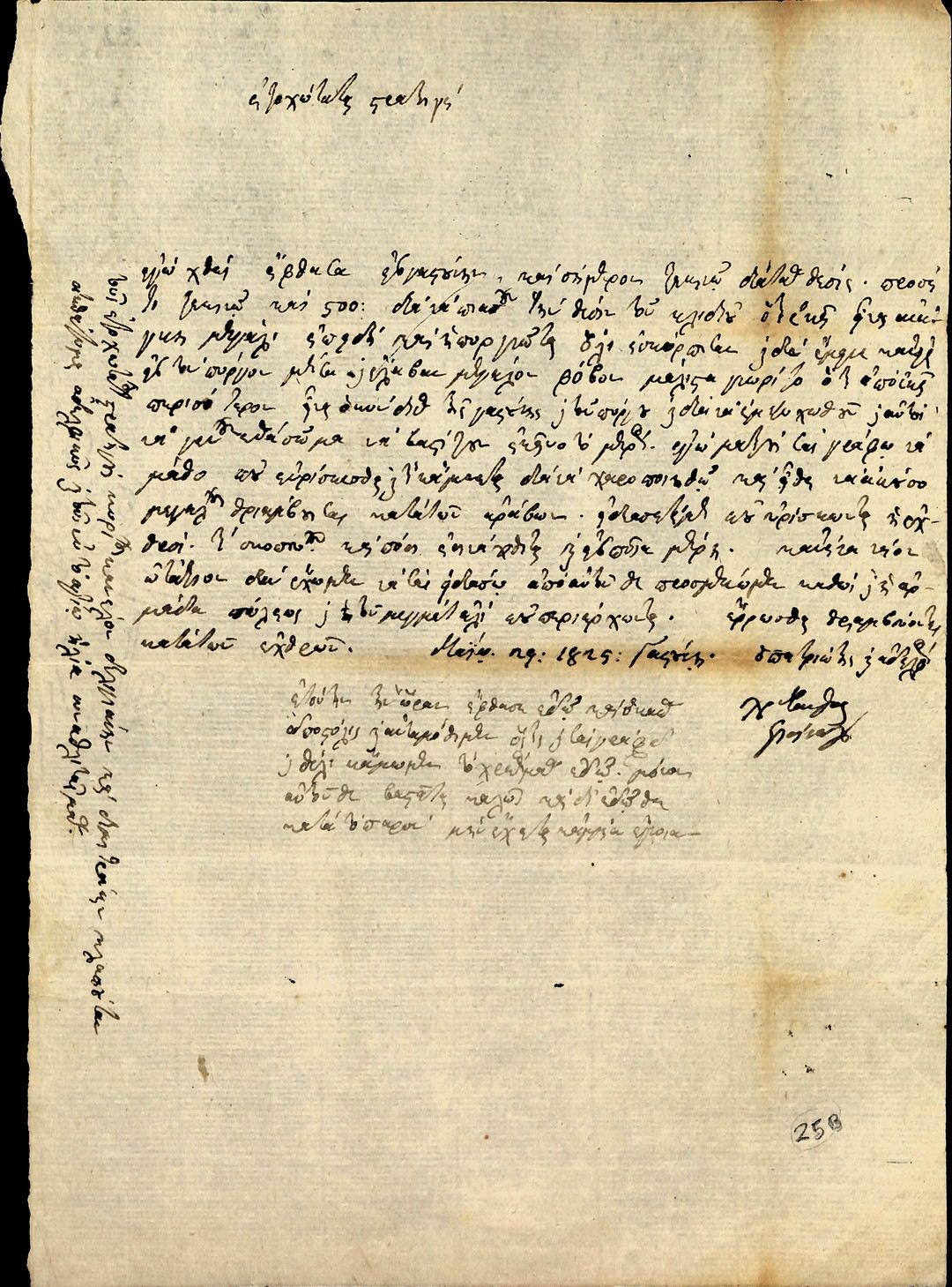 | Τίτλος | Επιστολη Βαρωνου Rosaroll Scorza προς Θεοδωρο Κολοκοτρωνη αναφορικα με αφιξη του απο την Ζακυνθο στη Γαστουνη να υπηρετηση των αγωνα και βοηθωντας στην συσταση ιππικου. |
