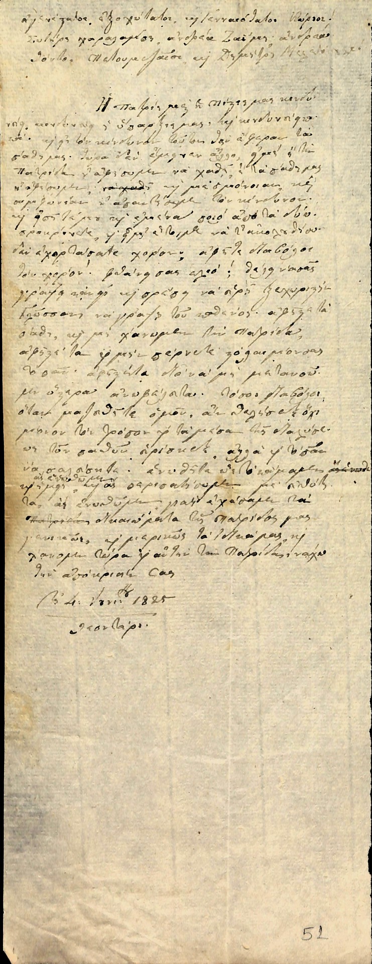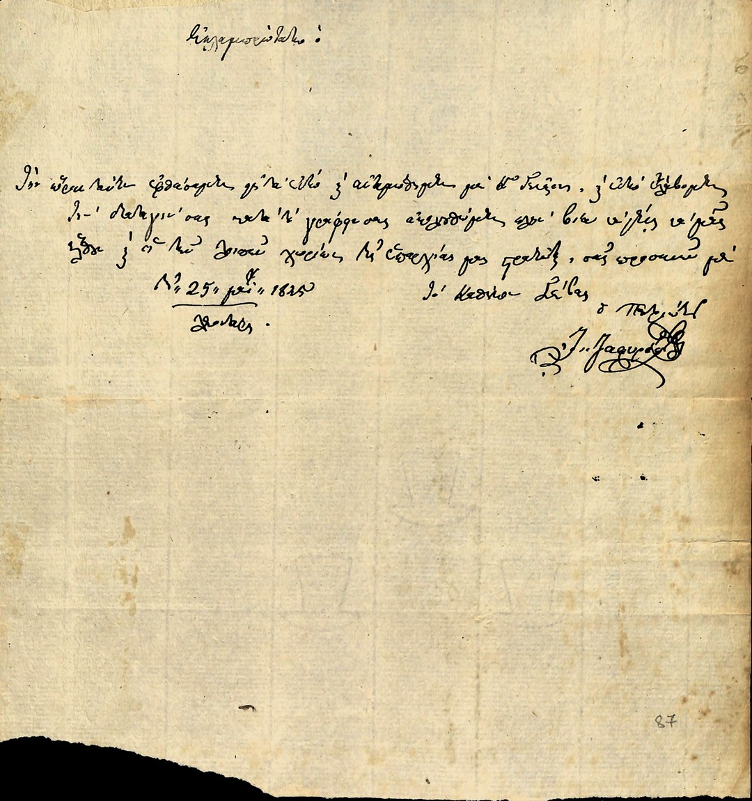 | Τίτλος | Επιστολή Στρατηγού Θεόδωρου Κολοκοτρώνη προς Π.Δ.Ε, Εκτελεστικό για την φρικτή λιποταξία χιλιάδων αγωνιστών, την δειλία του στρατεύματος που απέμεινε και την σοβαρή καθυστέρηση των στρατευμάτων του Μαυρομιχάλη |