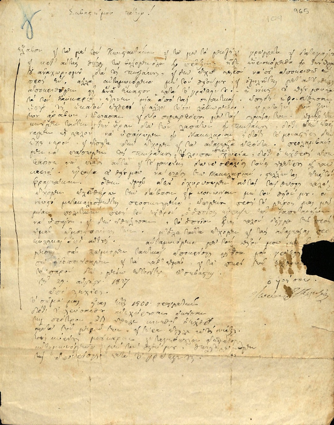 | Τίτλος | Επιστολη Βασιλη Πετμεζα προς Θεοδωρο Κολοκοτρωνη - αναφορικα με ανεφοδιασμο εχθρου απο την Πατρα και την μετεπειτα επιθεση και λεηλασια μαζι με προσκυνημενους οπλαρχηγους σε λοιπα χωρια τα οποια αντιστεκονται. Απο τους αιχμαλωτους, εναν τον ψισανε ζωντανο! |