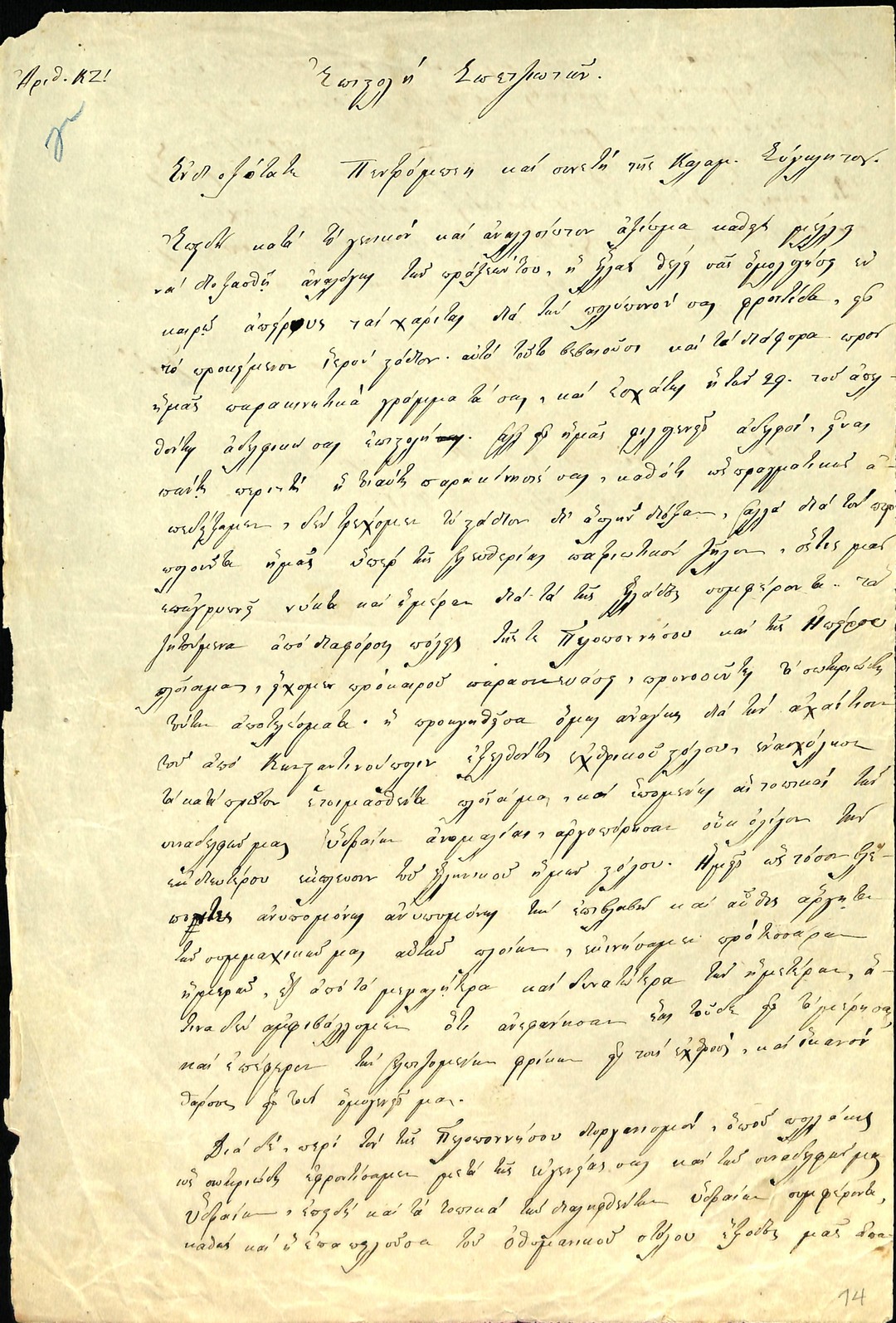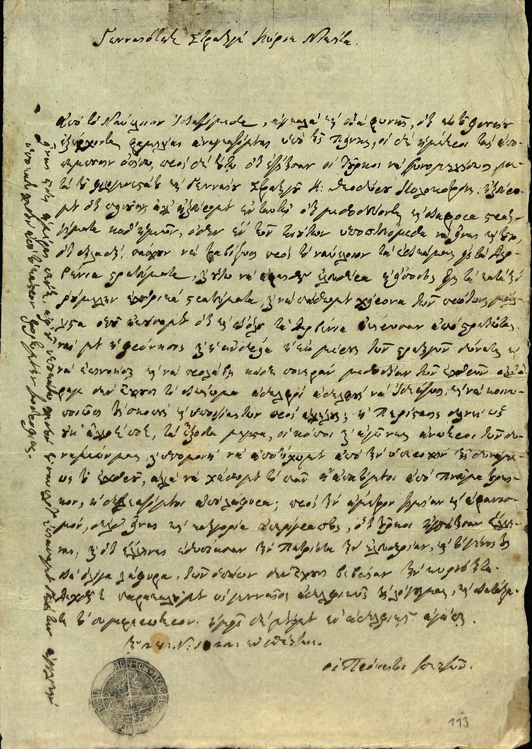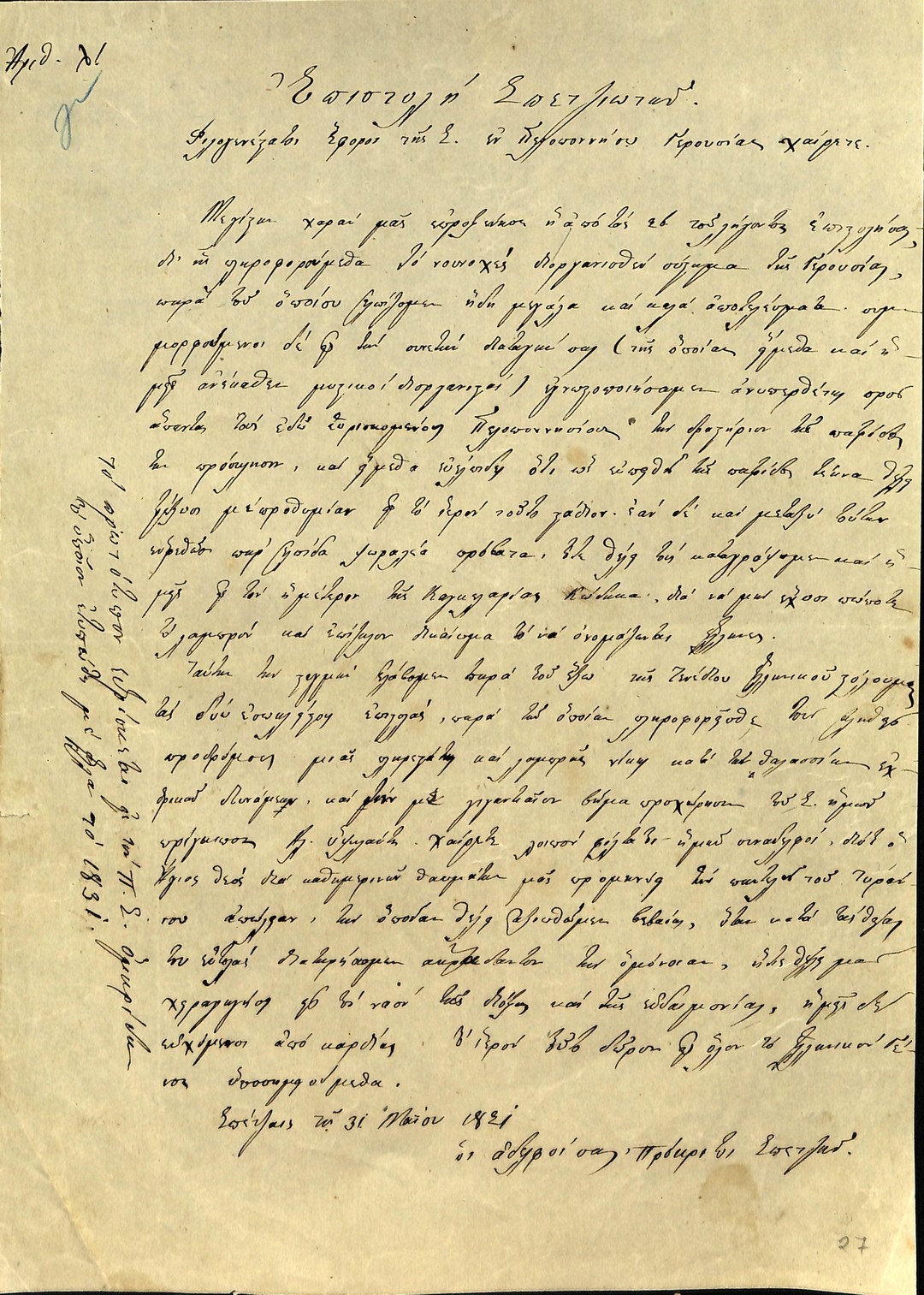 | Τίτλος | Επιστολή Σπετσιωτών προς Πετρόμπεη Μαυρομιχάλη και Σύγκλητο Καλαμάτας σε απάντηση στην πρόσκληση για συγκρότηση Εθνικής Συνέλευσης. |