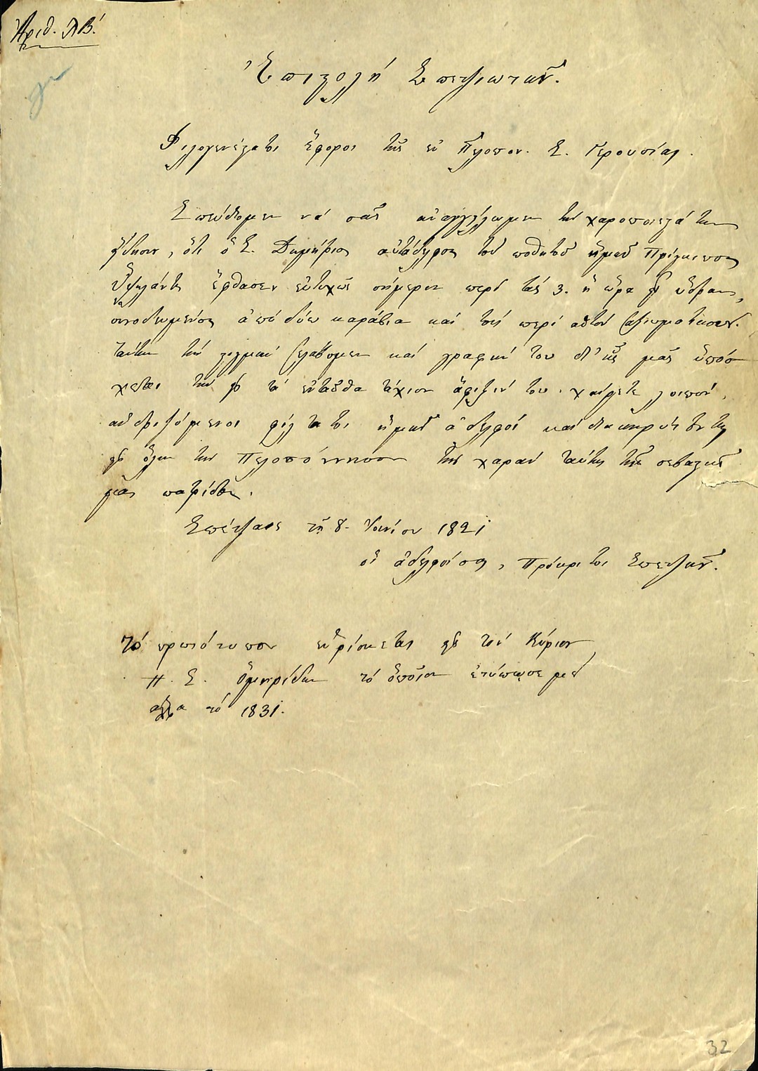 | Τίτλος | Επιστολη προκριτων Σπετσων προς Εκτελεστικο αναφορικα με αιτηση αποστολης πολεμοφοδιων προς οχυρωση και αντιμετωπιση επικειμενης επιθεσης απο τον αιγυπτιακο στολο |