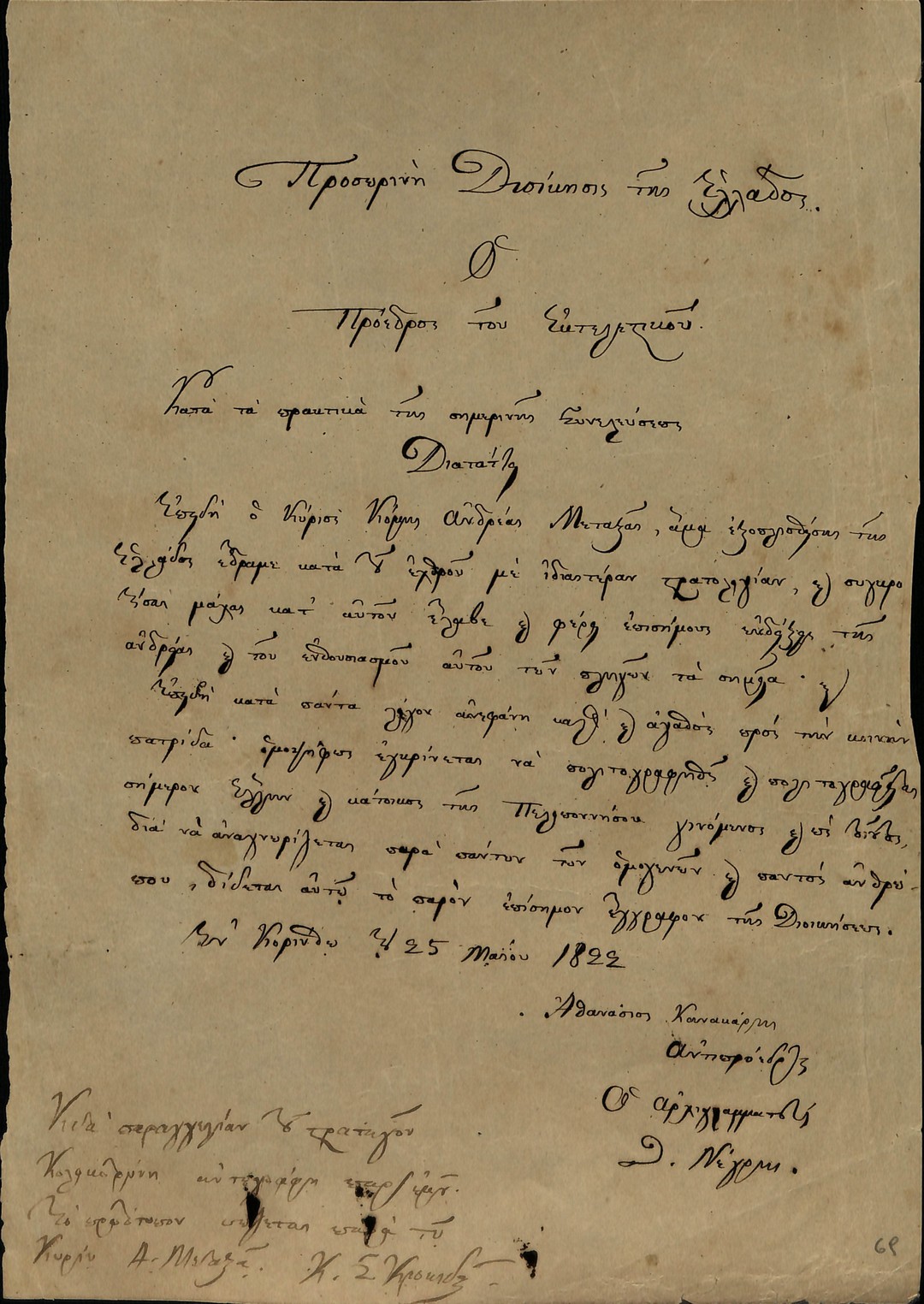 | Τίτλος | Επιστολή, Π.Δ.Ε και ο πρόεδρος του Εκτελεστικού πολιτογραφεί Έλληνα, κάτοικο Πελοποννήσου τον Κόμη Ανδρέα Μεταξά |