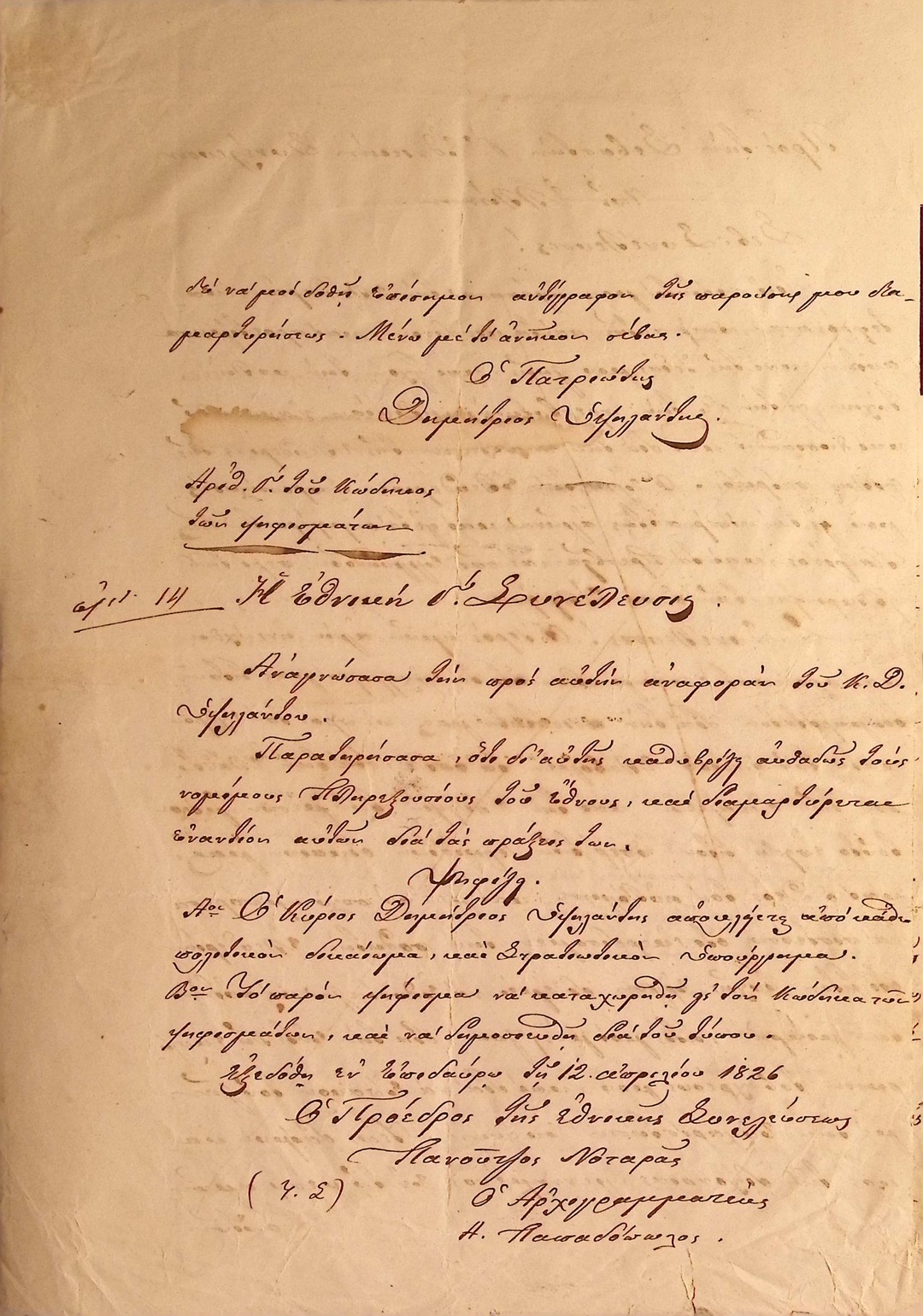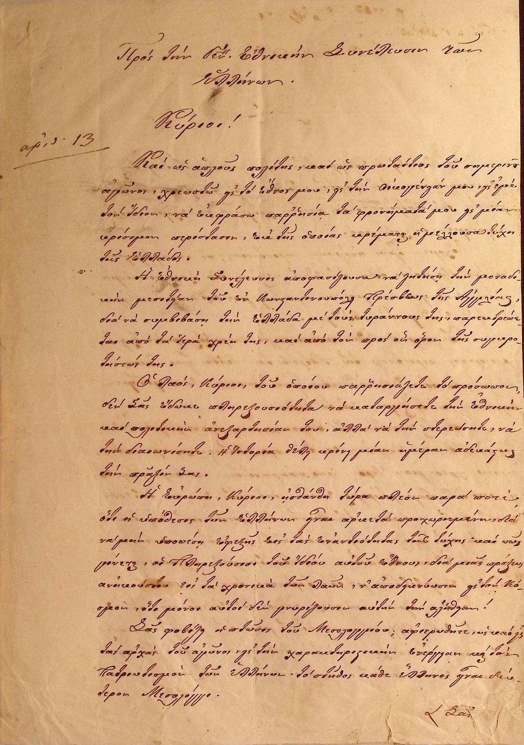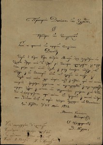 | Τίτλος | Επιστολη Δημητριου Υψηλαντη προς Γ.Εθνοσυνελευση - αναφορικα με διαματυρια του για την αιτηση της κυβερνησης να μεσιτευσει η Αγγλια εκ μερους της για συμβιβασμο με την Οθωμανικη Αυτοκρατορια |