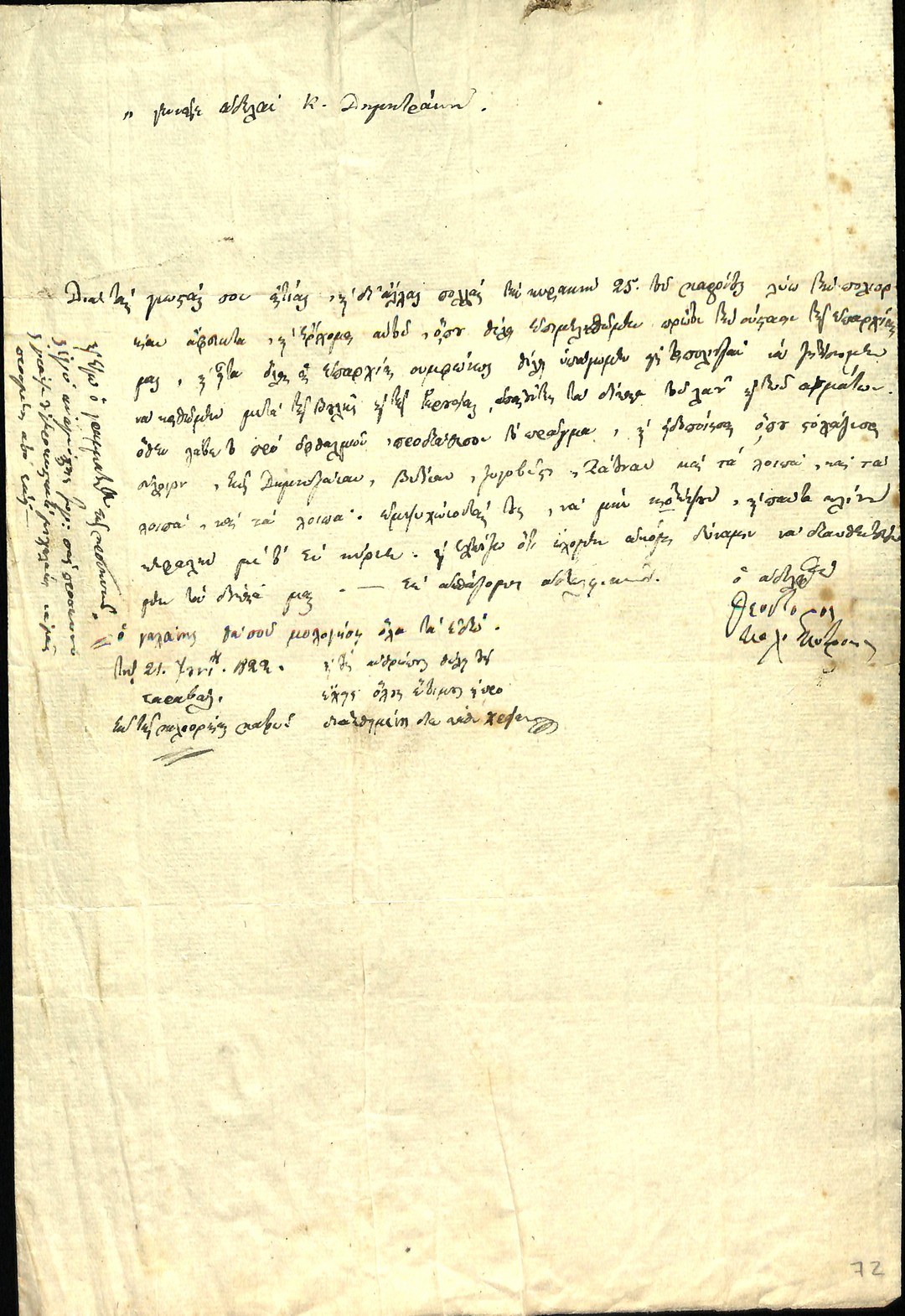 | Τίτλος | Επιστολή Θεόδωρου Κολοκοτρώνη προς προκρίτους Σπετσών περί παραλαβής πολεμοφοδίων και της νίκης στο Βαλτέτσι. |