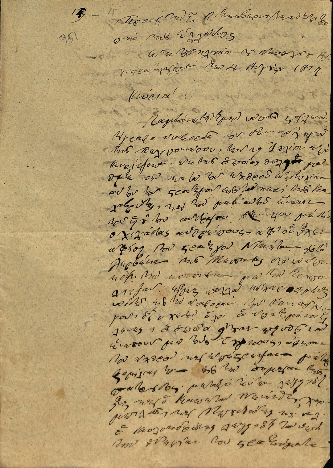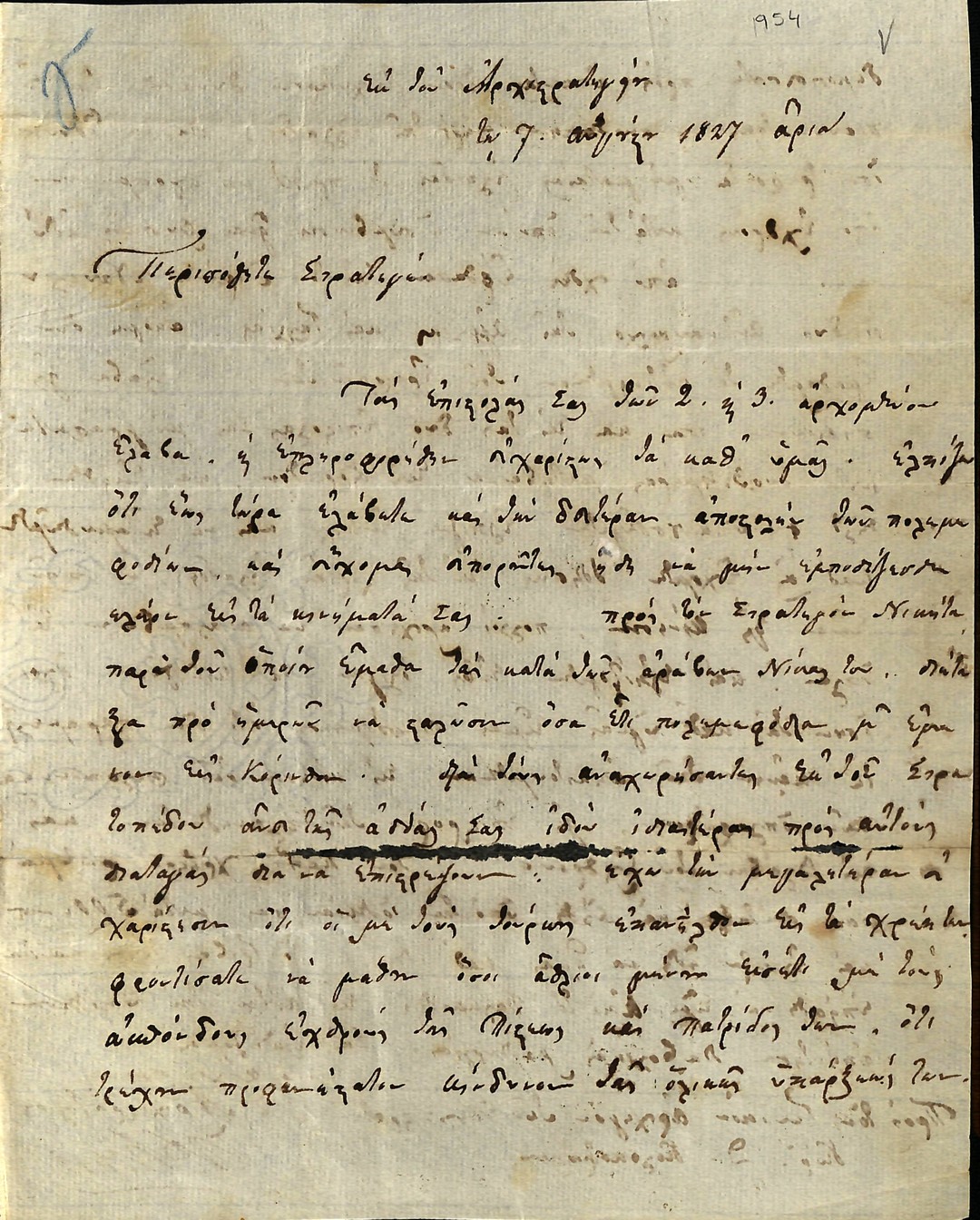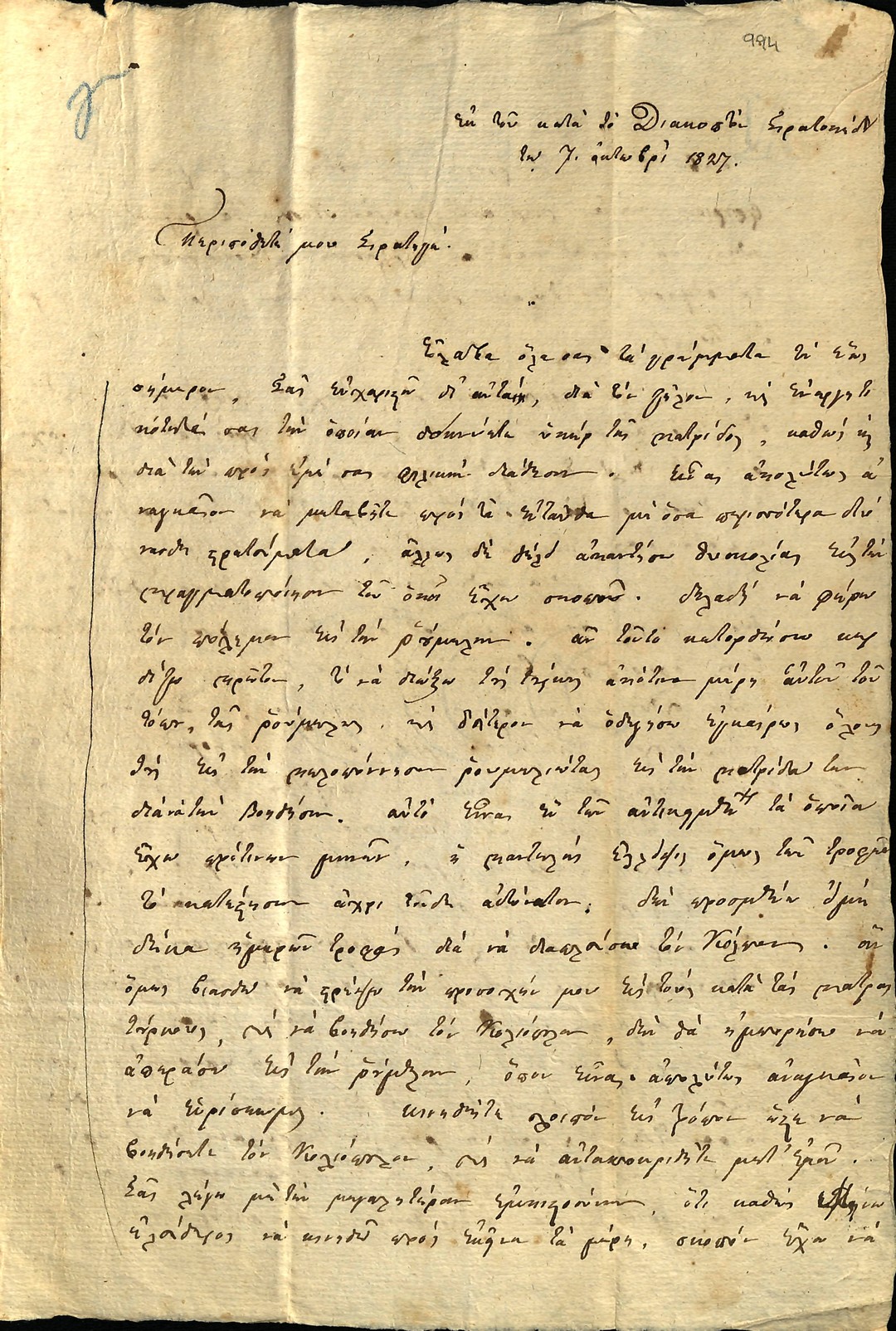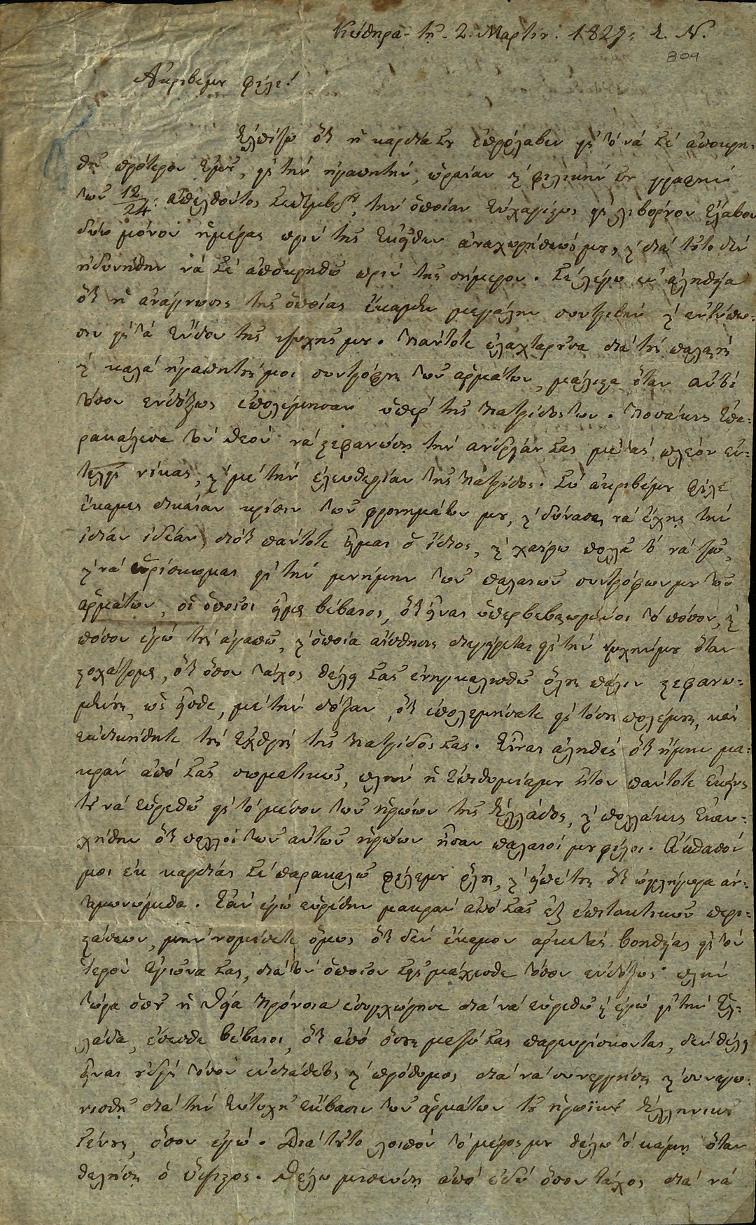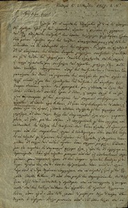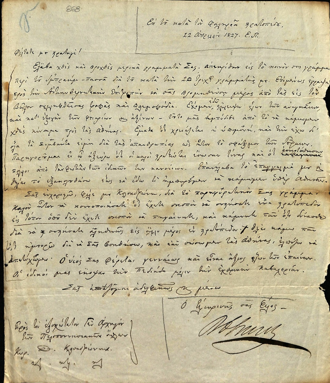 | Τίτλος | Επιστολη Richard Church προς Θεοδωρο Κολοκοτρωνη - αναφορικα με κινησεις του Ιμπραιμ και αποστολης εφοδιων. Επιπλεον ενημερωση για διαφορες μαχες και επαινοι για τον γιο του Γενναιο |