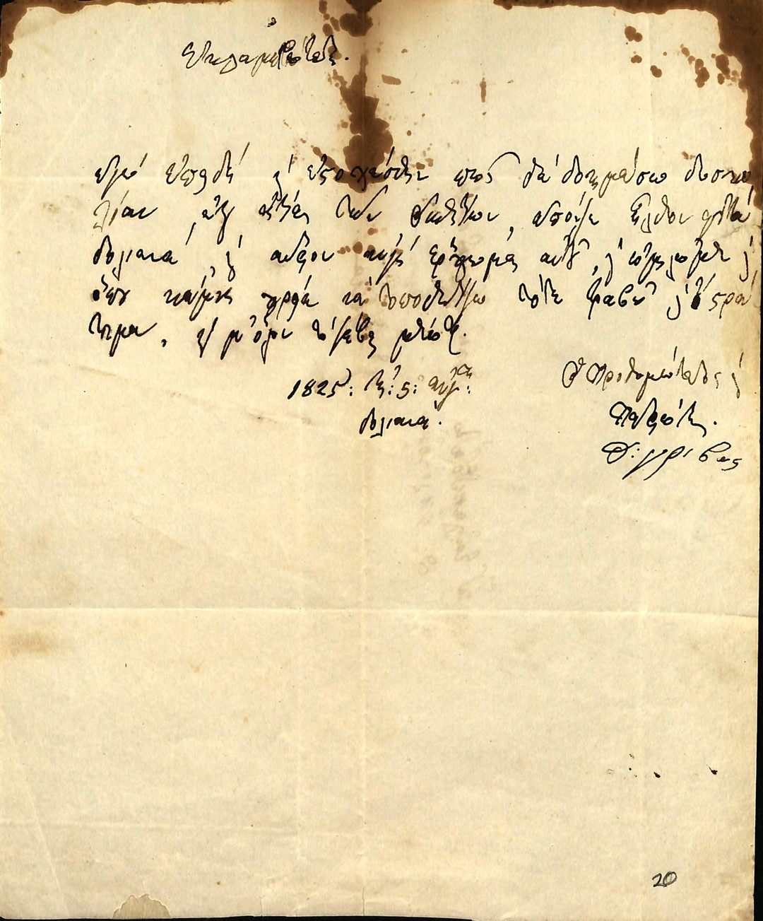 | Τίτλος | Επιστολη θεοδωρου Γριβα προς Θεοδωρο Κολοκοτρωνη αναφορικα με συναντηση τους. |