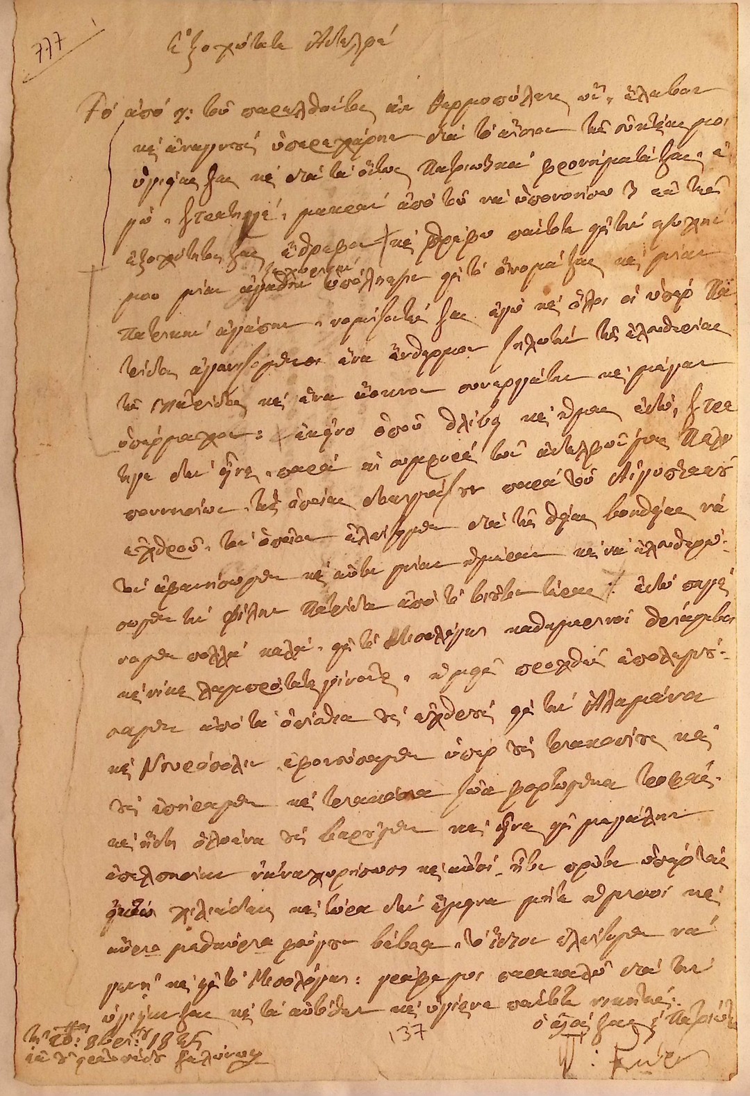| Τίτλος | Επιστολη Γιαννη Γκουρα προς Θεοδωρο Κολοκοτρωνη αναφορικα με εκβαση μαχων στη Στερεα Ελλαδα και το Μεσολογγι |