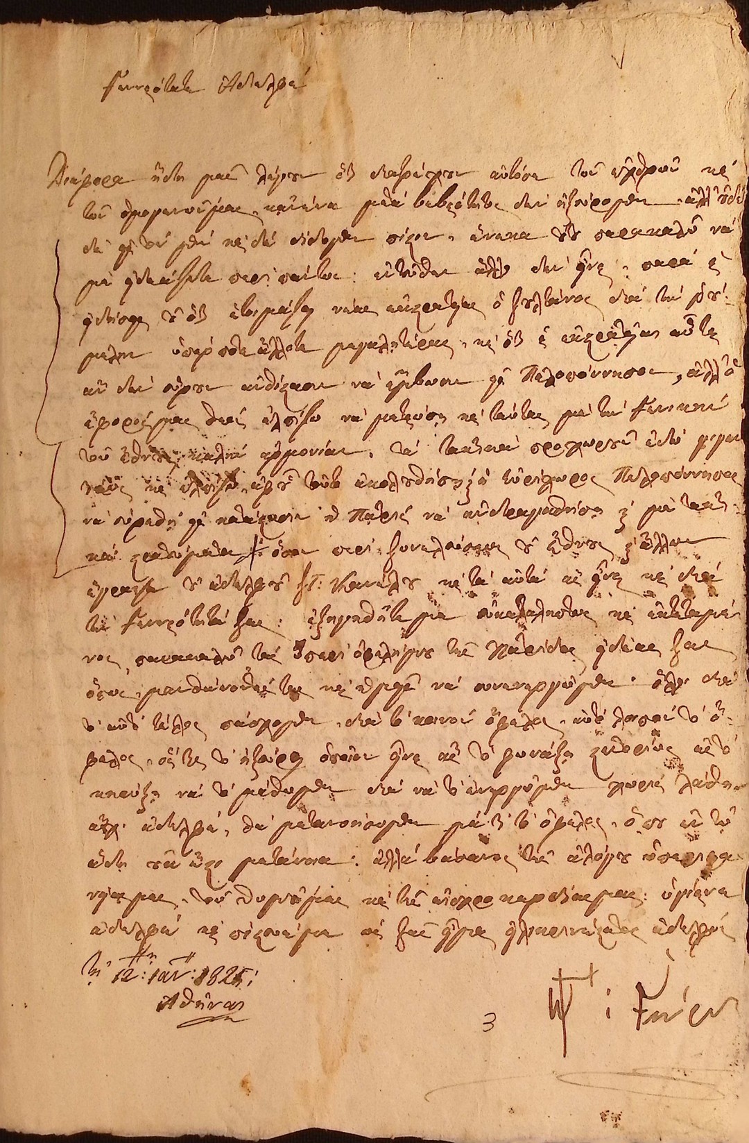 | Τίτλος | Επιστολη Γιαννη Γκουρα προς τον Θεοδωρο Κολοκοτρωνη σχετικα με διαπραγματευσεις που λαμβανουν μερος ζητωντας τη γνωμη του αλλα και συμβουλες. Επιπλεον ενημερωση για νικες στο Μεσολογγι και εχοντος καλων των πραγματων να ενωθουν τα Ρουμελιωτικα στρατευματα μετα της Πελοποννησου. |