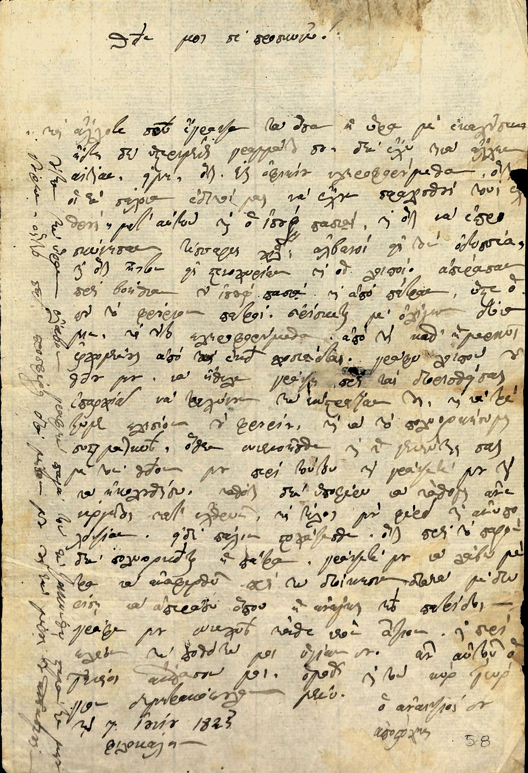 | Τίτλος | Επιστολή Αποστόλη Κολοκοτρώνη προς Θεόδωρο Κολοκοτρώνη για ζητήματα στρατολόγησης δια της βίας [ .. Από το ένα μέρος τους ευγάζω και από το άλλο μέρος φεύγουν ] |