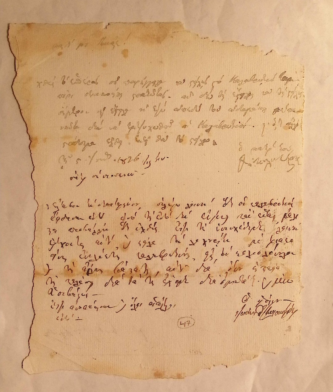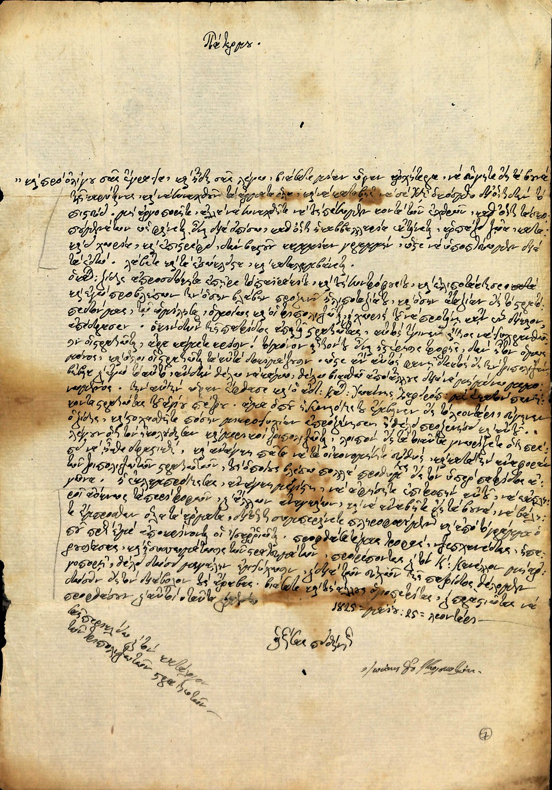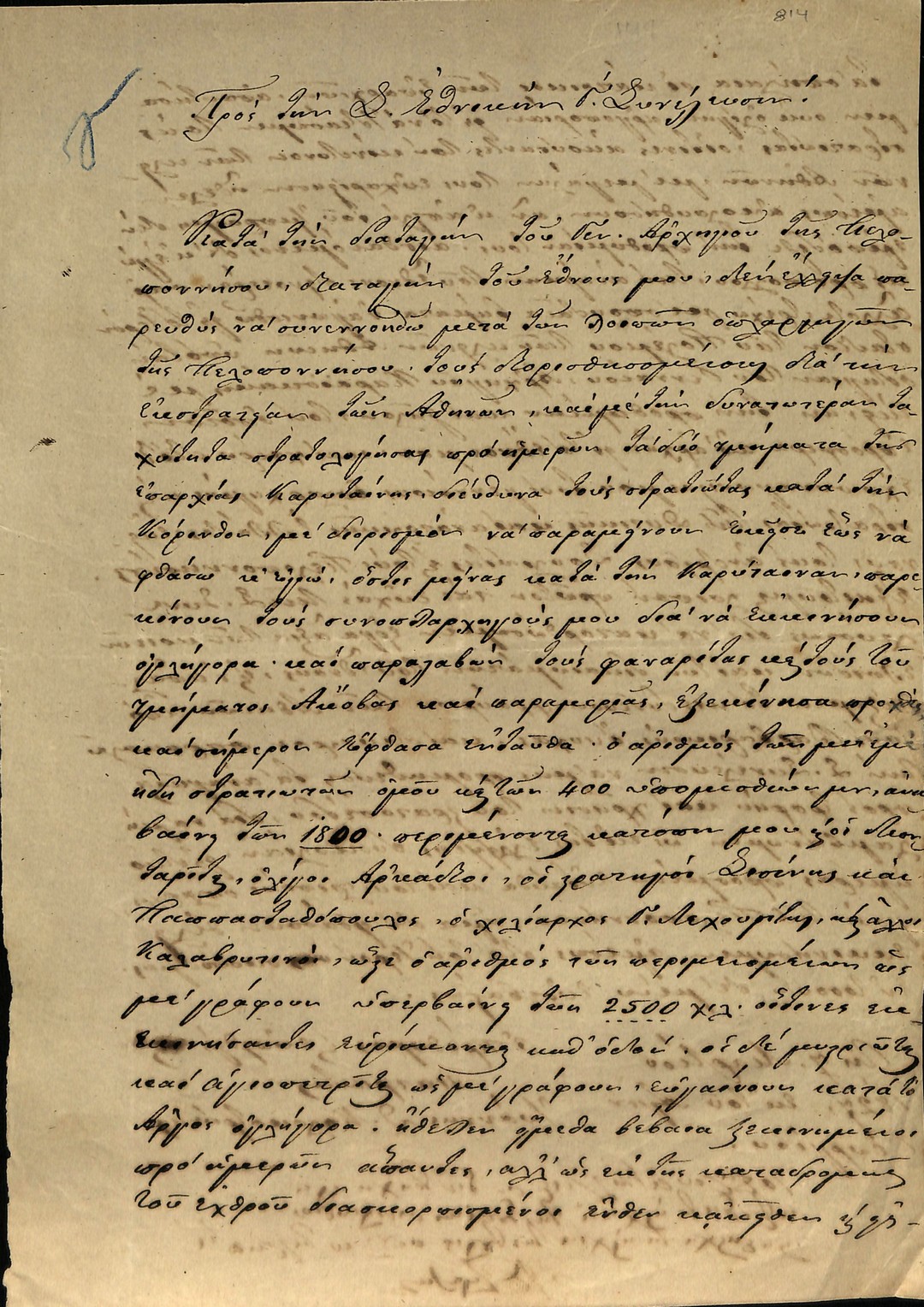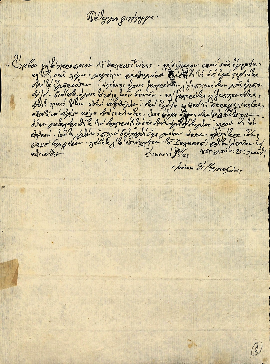 | Τίτλος | Επιστολή του Ιωάννη (Γενναίου) Κολοκοτρώνη προς τον πατέρα του Θεόδωρο Κολοκοτρώνη, με την οποία μεταφέρει πληροφορίες από τον Γιαννάκη Γκρίτζαλη για την σύγκρουση με τους Αιγυπτίους στο χωριό Ψάρι (Τριφυλίας) |
