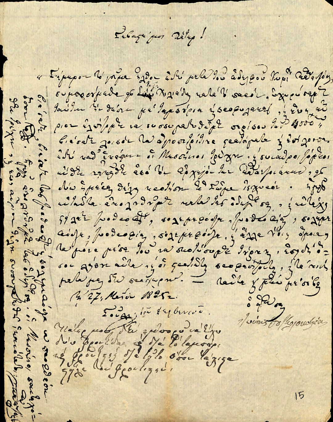 | Τίτλος | Επιστολή Ιωάννη Θ.Κολοκοτρώνη (Γενναίου) προς Θεόδωρο Κολοκοτρώνη σχετικά με την στρατηγική του Ιμπραήμ κινήσεις και αναφορά κινήσεων εχθρού |