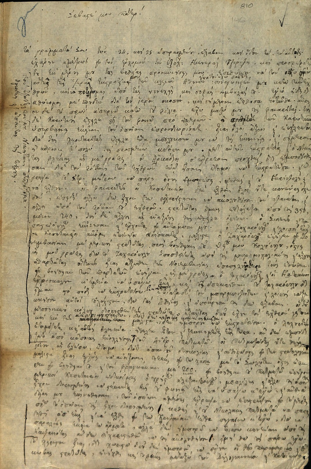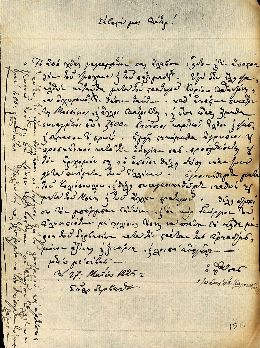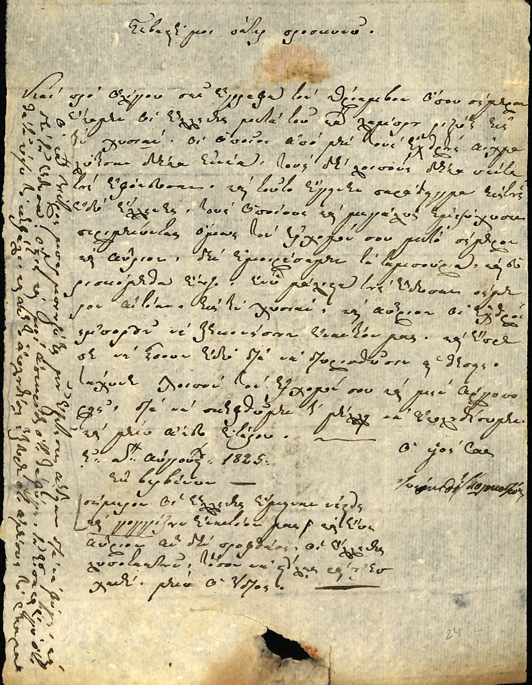 | Τίτλος | Επιστολη Γενναιου προς Θεοδωρο Κολοκοτρωνη σχετικα με νικη του Λαμπρου Ριζιωτη με αποτελεσμα εμψυχωσης των στρατιωτων. Αιτηση αποστολης εφοδιων προς αποφυγη λιποταξιων. |