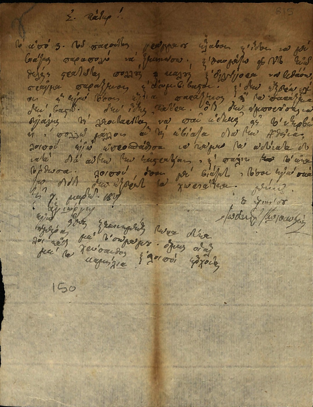 | Τίτλος | Επιστολή Ιωάννη Θ.Κολοκοτρώνη (Γενναίου) προς Αρχιστράτηγο Θεόδωρο Κολοκοτρώνη με πληροφορίες για τις κινήσεις στρατεύματος Ιμπραήμ |