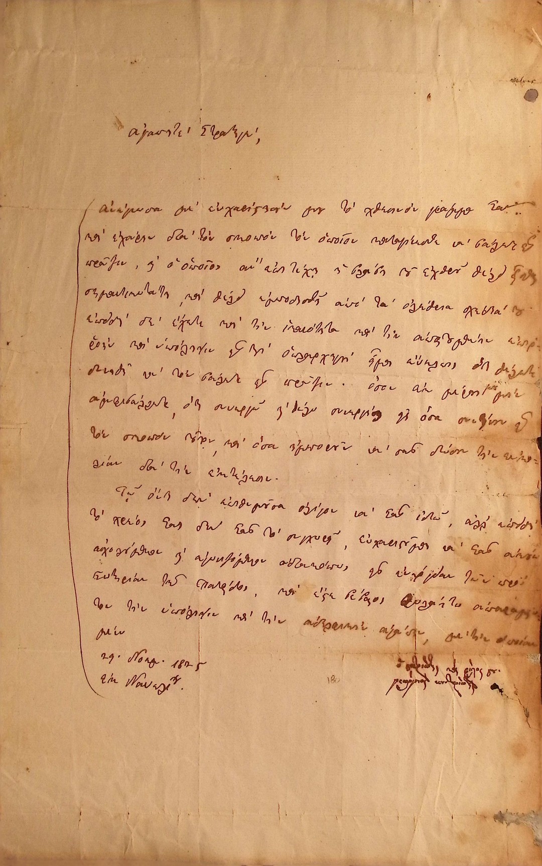 | Τίτλος | Επιστολή Γεώργιου Κουντουριώτη προς Θεόδωρο Κολοκοτρώνη απάντηση επί πρότασης διορισμού Αναγνώστη Δεληγιάννη ως Υπουργού Εσωτερικών |