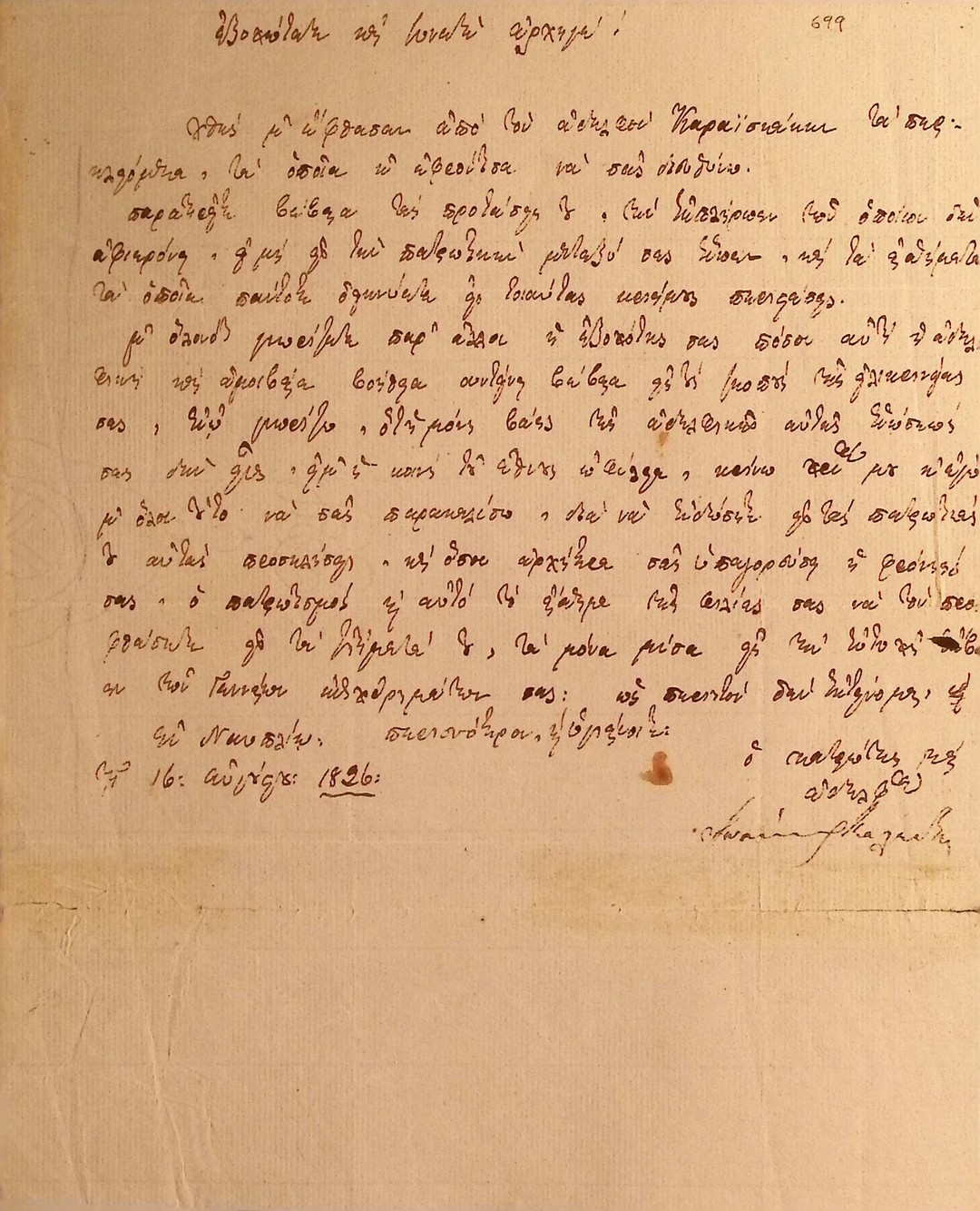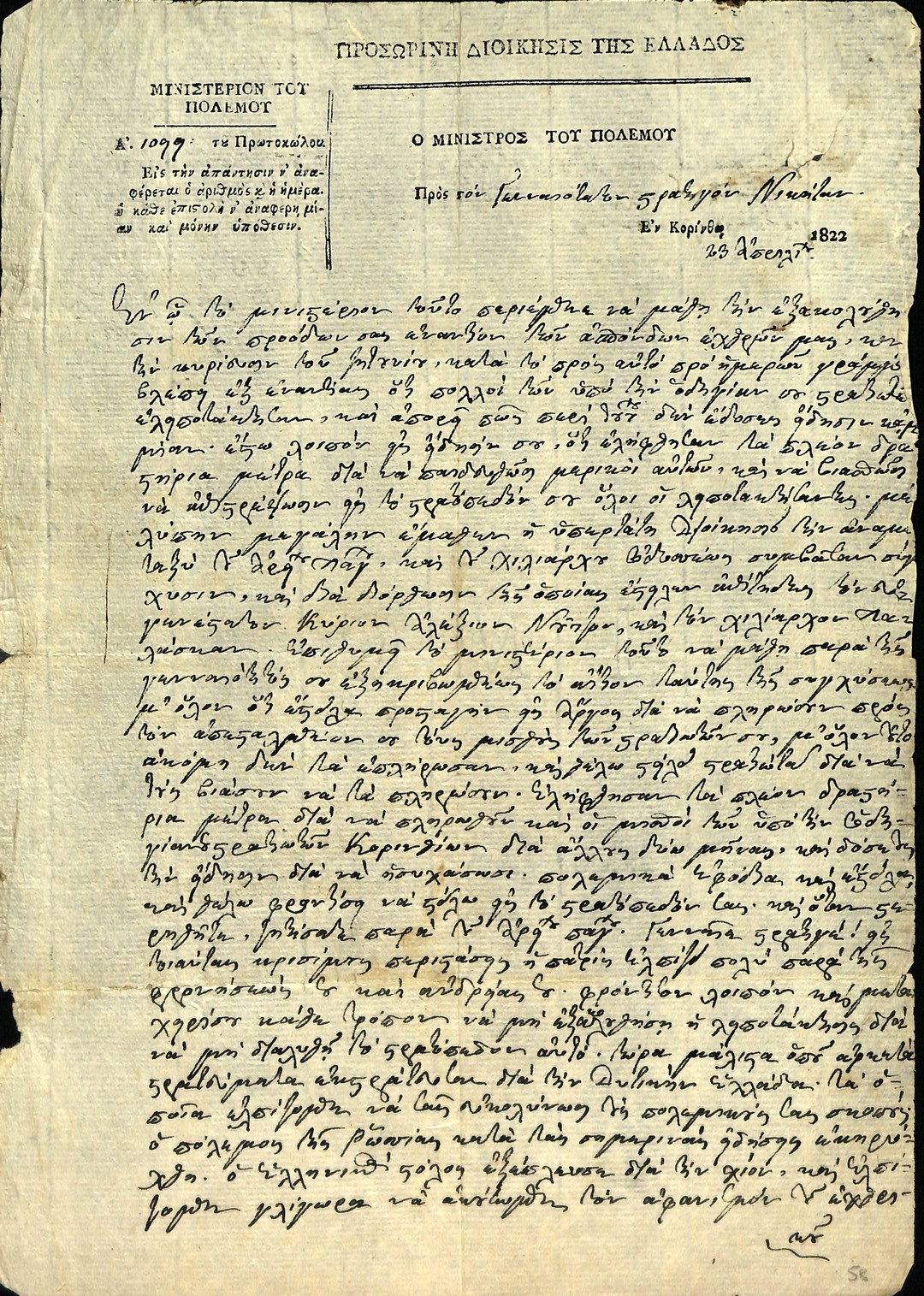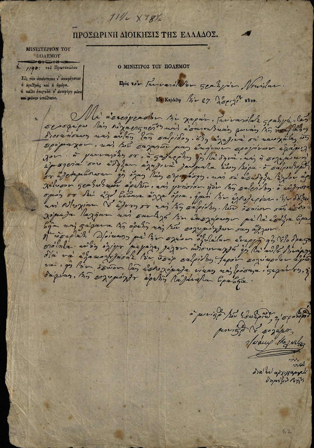| Τίτλος | Επιστολή Π.Δ.Ε, του Υπουργού Πολέμου Ιωάννη Κωλέττη προς τον Νικήτα Σταματελόπουλου (Νικηταρά) συνοδευτική των νέων στρατευμάτων |