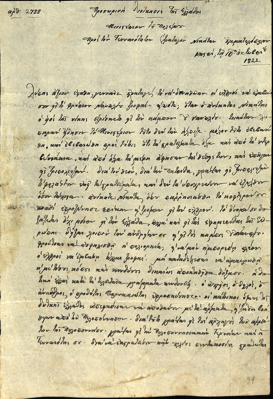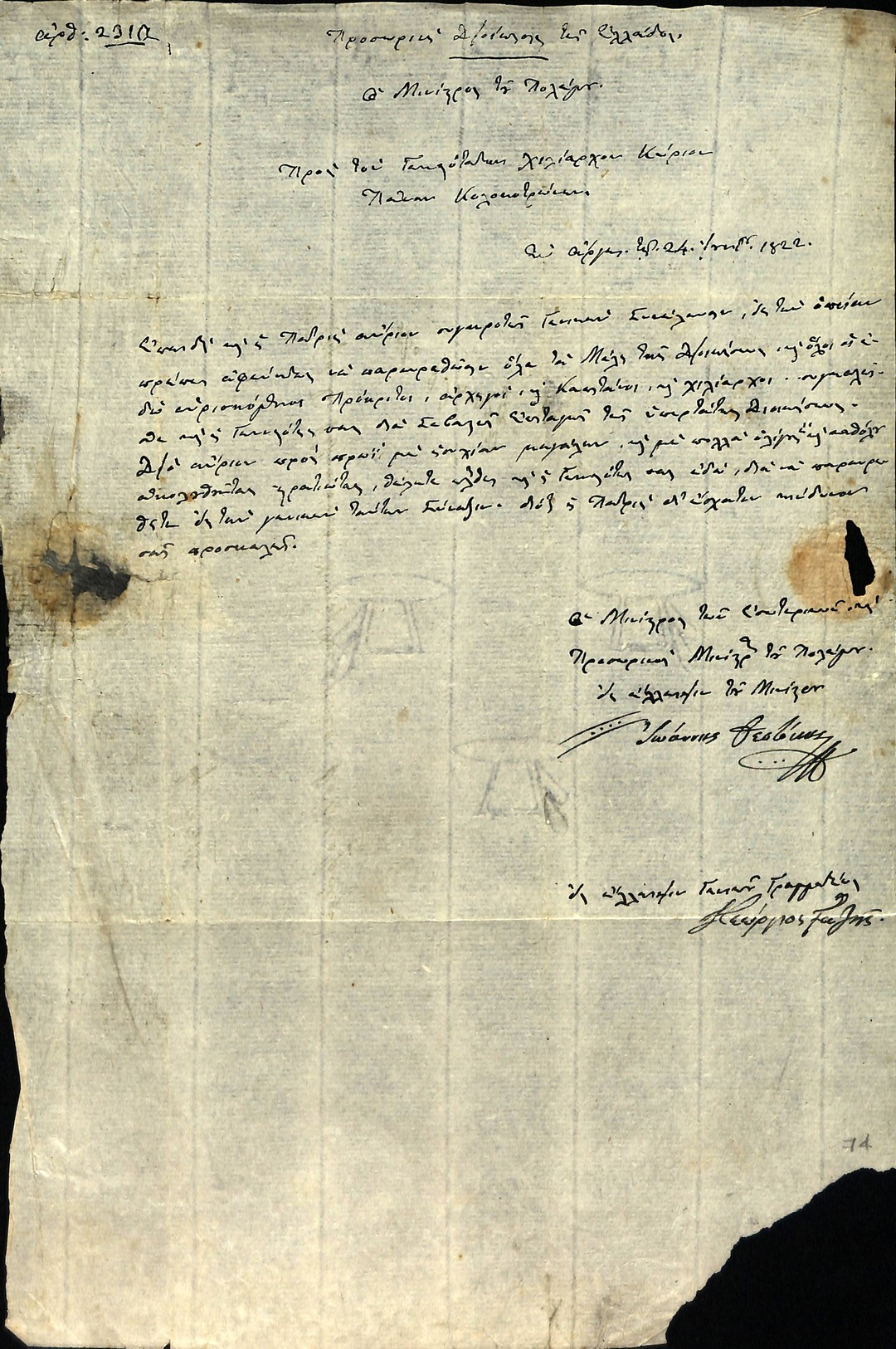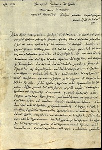 | Τίτλος | Επιστολή - πρόσκληση του Υπουργού Πολέμου Ιωάννη Κωλέττη προς τον Χιλίαρχο Πάνο Θ.Κολοκοτρώνη |