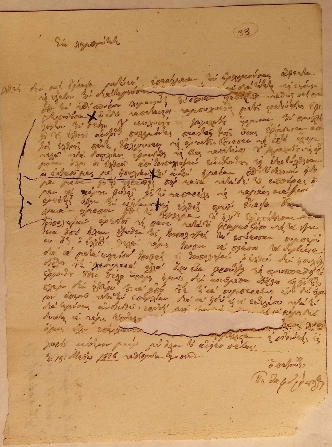 | Τίτλος | Επιστολη Π. Ζαφειροπουλου προς Θεοδωρο Κολοκοτρωνη - αναφορικα με μαχες πλησιον της Τριπολιτσας |