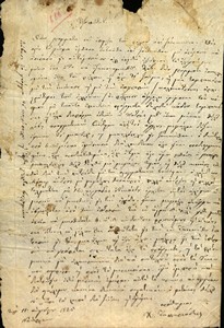 | Τίτλος | Επιστολη Χ.Ζαχαριαδη προς Θεοδωρο Κολοκοτρωνη αναφορικα με νεα απο την ζακυνθο και κυκλοφορια διαφημιστκων ενθυμιων του Κολοκοτρωνη π.χ. ταμπακιερες με την εικονα του, καδρα κλπ. Επιπλεον νεα για αναχωρηση του γιου του Μιαουλη στο Λονδινο και ειδησεις για αναχωρηση του Λορδου Κοχραν με ενισχυσεις. |