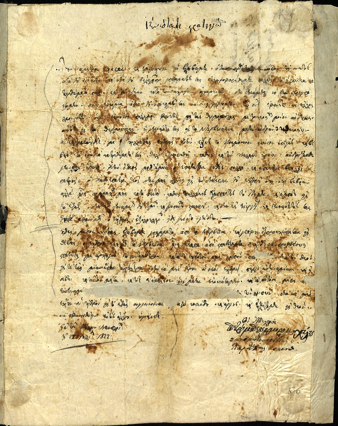 | Τίτλος | Επιστολή συμφιλίωσης, Αλέξανδρου Μαυροκορδατου, Πετρόμπεη Μαυρομιχάλη και άλλων οπλαρχηγών προς Ιωάννη Ράγκο και Γεώργιο Καραισκάκη |