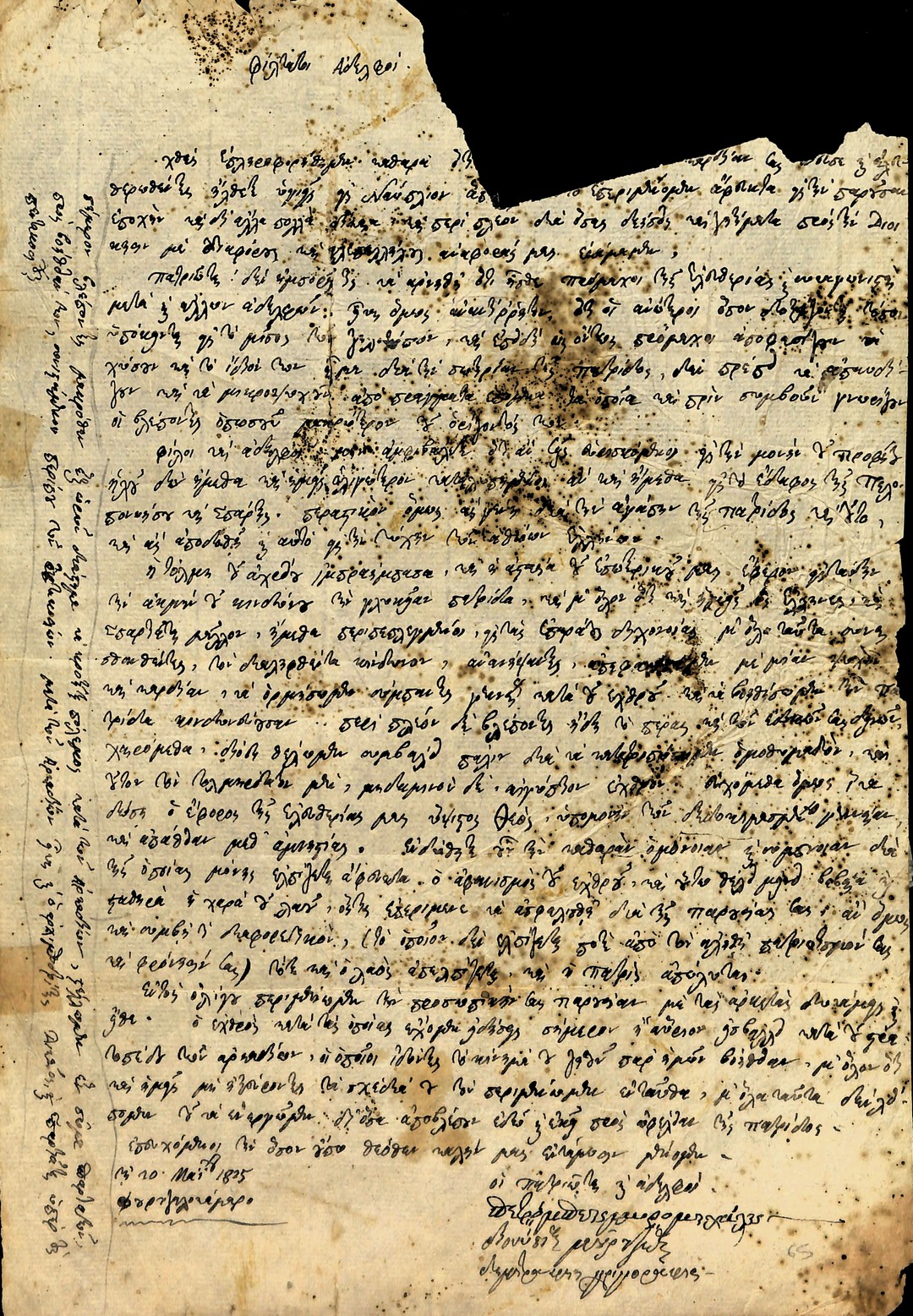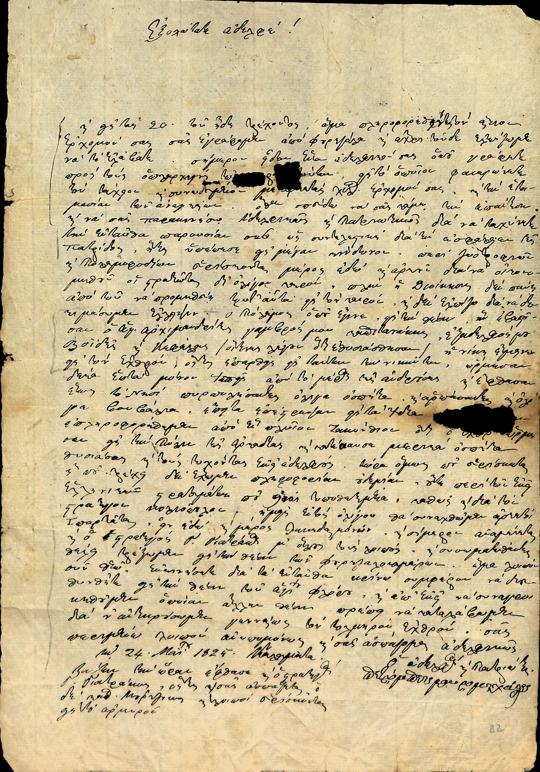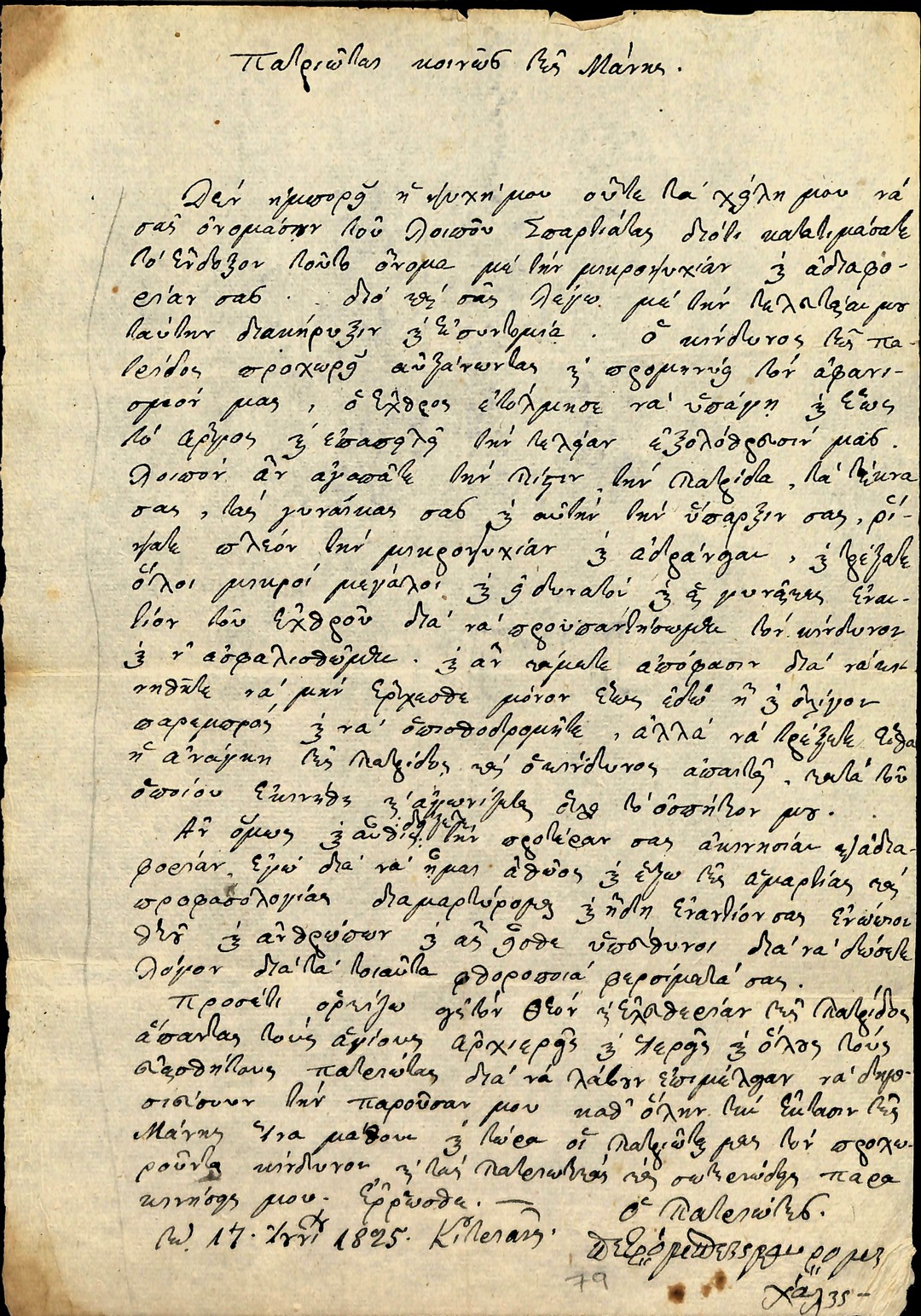 | Τίτλος | Επιστολή Πετρόμπεη Μαυρομιχάλη κ.α Μανιατών προς Θεόδωρο Κολοκοτρώνη κ.α Αρχηγούς για τον κίνδυνο του Ιμπραήμ Πασά και την ανάγκη ομόνοιας και σύμπνοιας των στρατευμάτων και Αρχηγών |