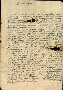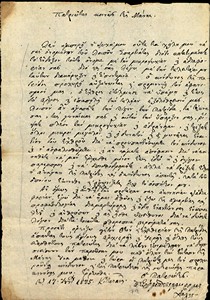 | Τίτλος | Επιστολη Πετρομπεη Μαυρομιχαλη προς Νικητα Σταματελοπουλου συγχαιροντας τον για τα κατωρθοματα του στο Μεσολογγι. Επιπλεον ενημερωση του για τις δυσκολιες ενθαρυσνης των Μανιατων λογω της επελασης του Ιμραιμ οπως και ενημερωση για την επικειμενη ανταλλαγη του γιου του και του αδελφου του Νικητα, Γεωργιου, ως αιχμαλωτοι πολεμου. |