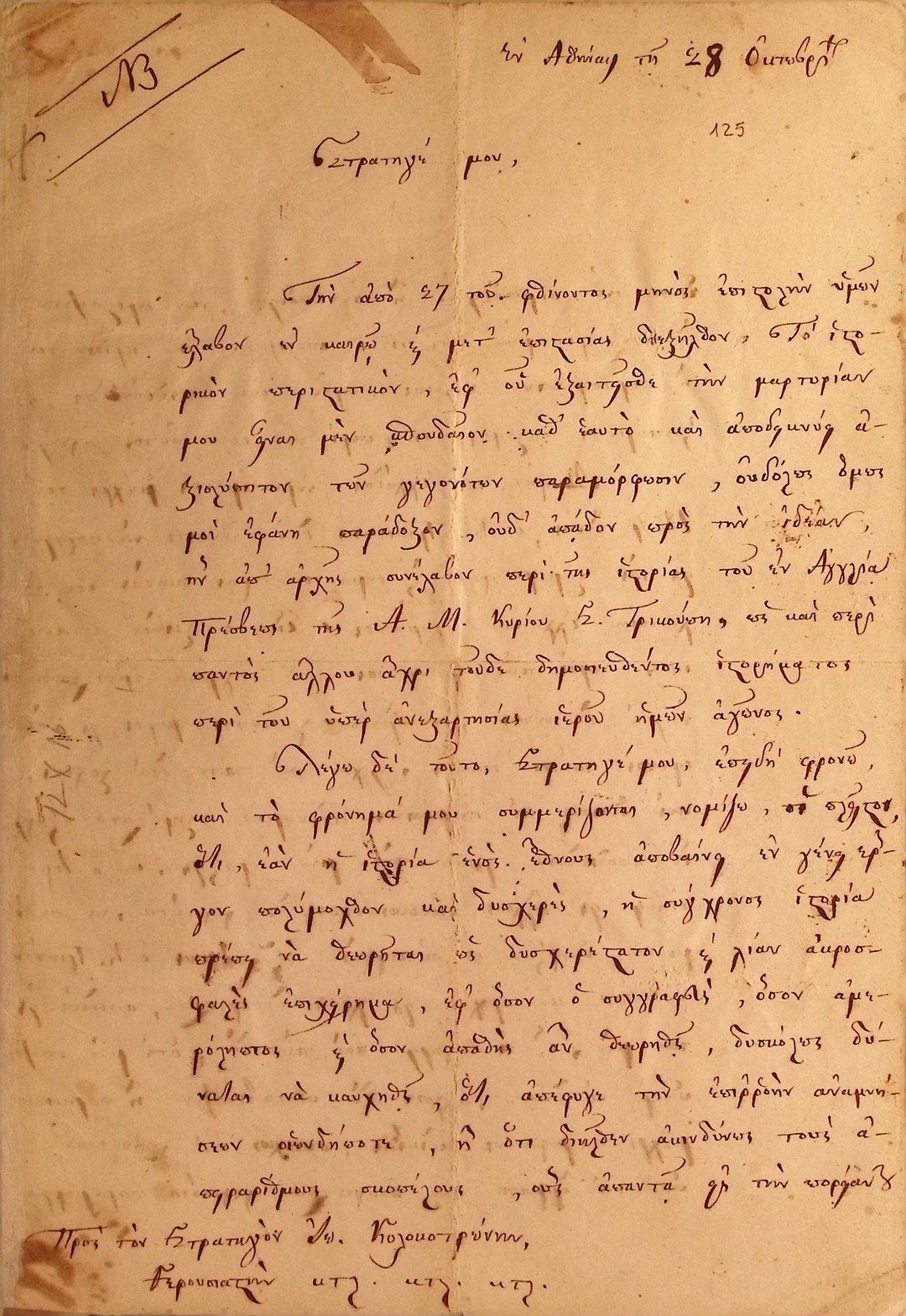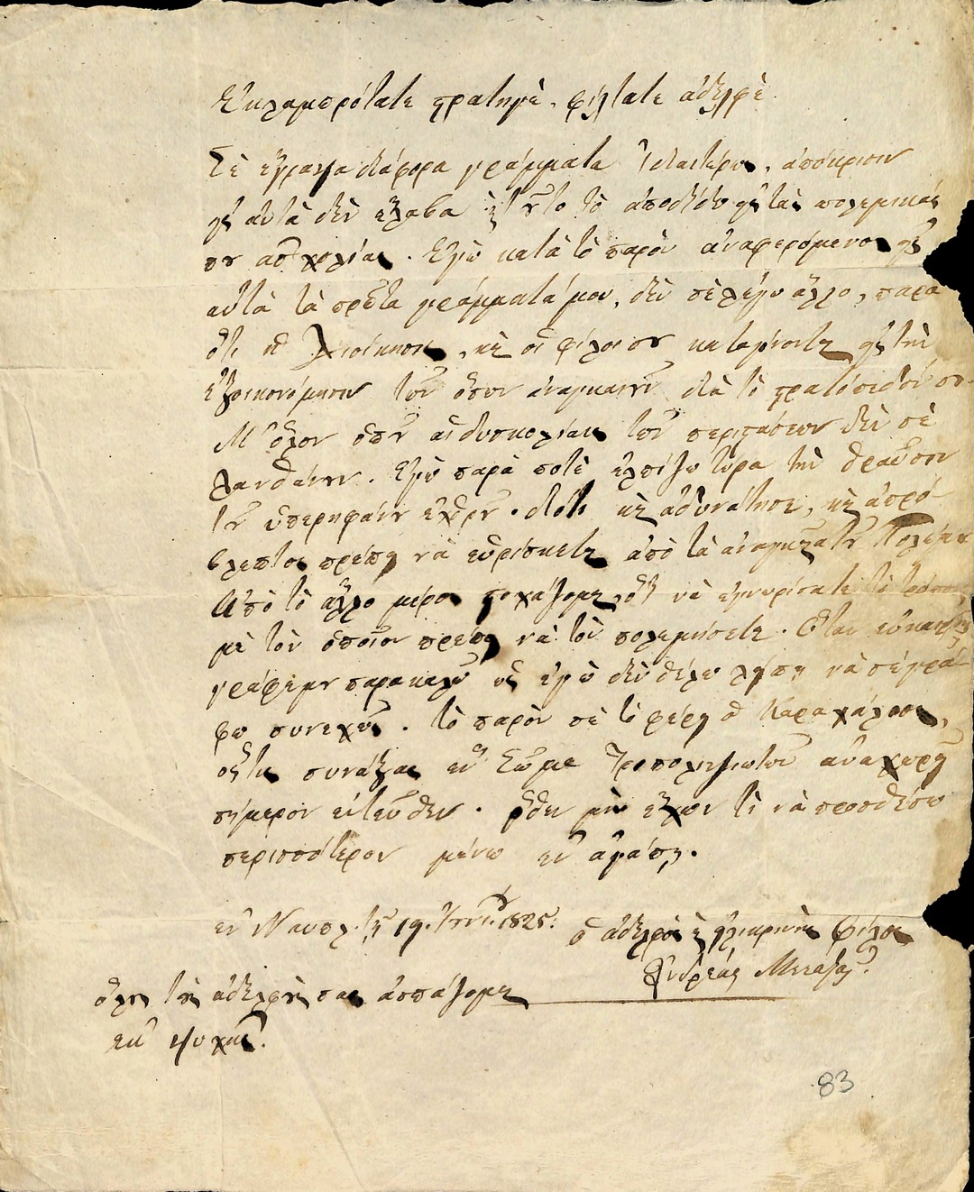 | Τίτλος | Επιστολη Ανδρεα Μεταξα προς Θεοδωρο Κολοκοτρωνη - αναφορικα με νεα πολιορκια Τριπολιτσας. Μεταξας ενημερωνει Κολοκοτρωνη περι της δυσκολιας παροχης πολεμοφοδιων και χρηματων απο την κυβερνηση |