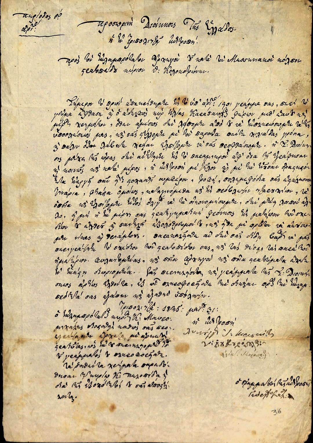 | Τίτλος | Επιστολή Π.Δ.Ε, Επιτροπή Τριπολιτσάς προς Στρατηγό Θεόδωρο Κολοκοτρώνη με την αποστολή εφοδίων και χρημάτων |