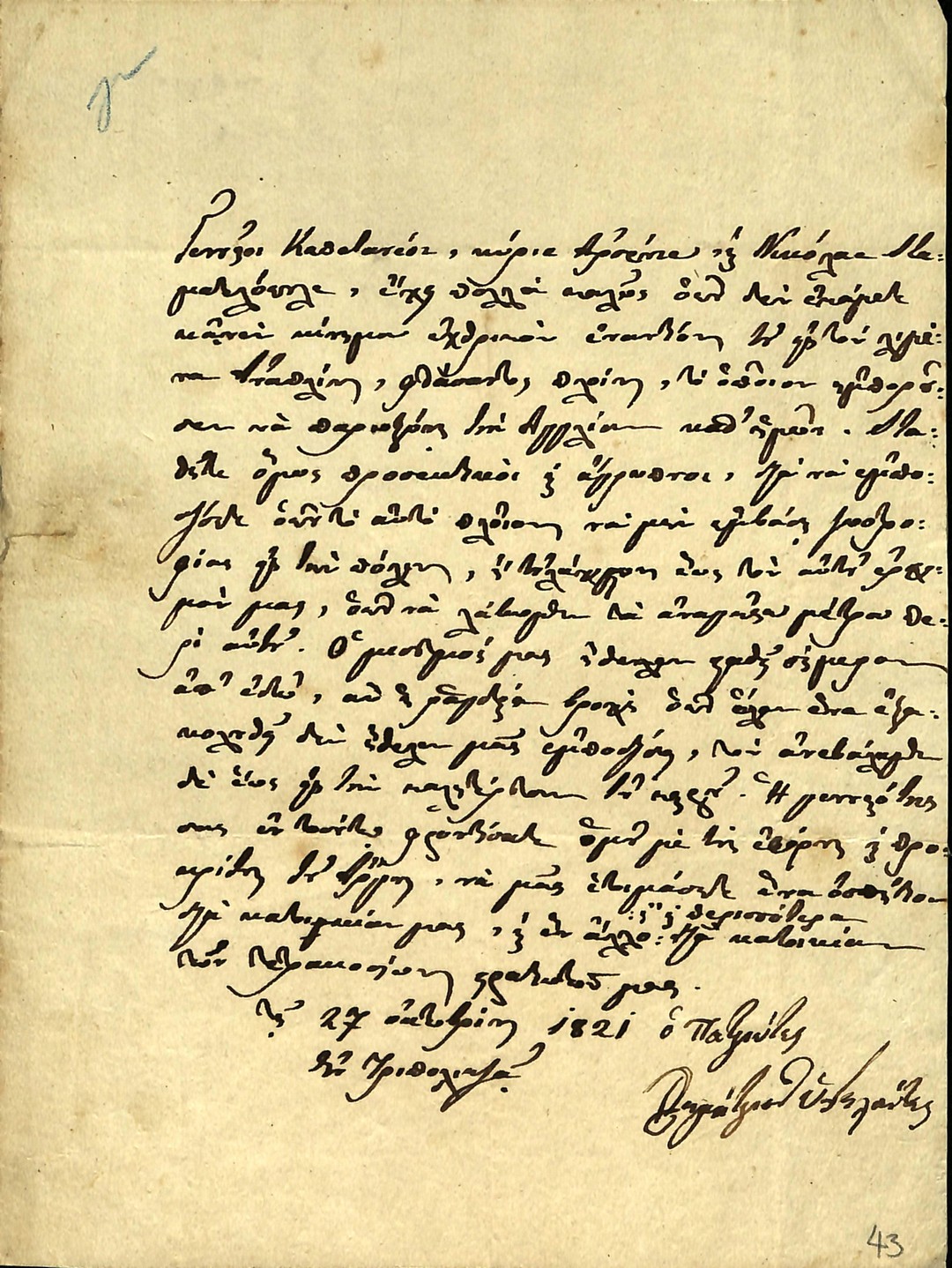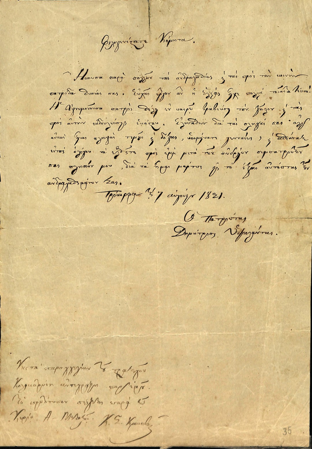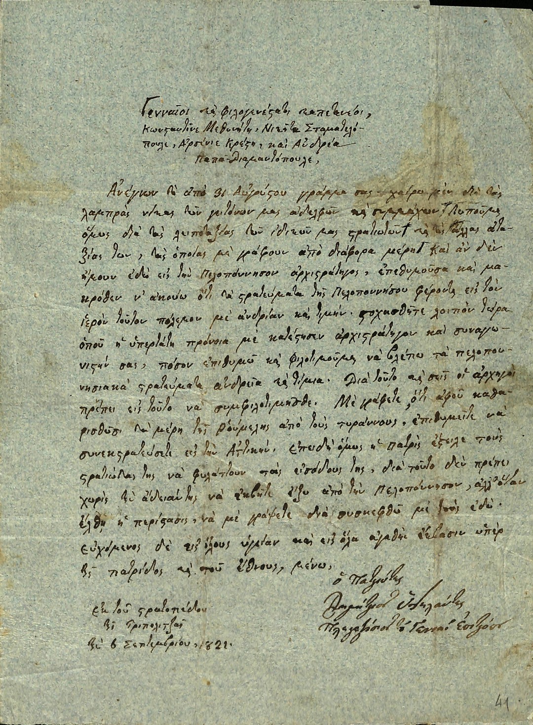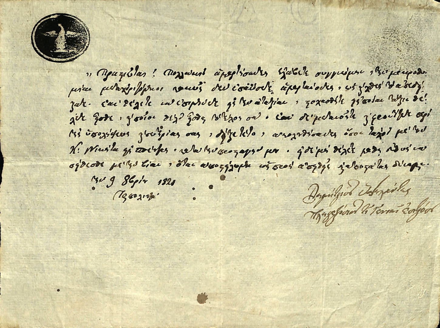 | Τίτλος | Επιστολή Δημήτριου Υψηλάντη και Κ. Μαυρομιχάλη προς Θεόδωρο Κολοκοτρώνη με πληροφορίες για κίνηση στρατευμάτων και αίτημα για νέες οδηγίες - διαταγές |