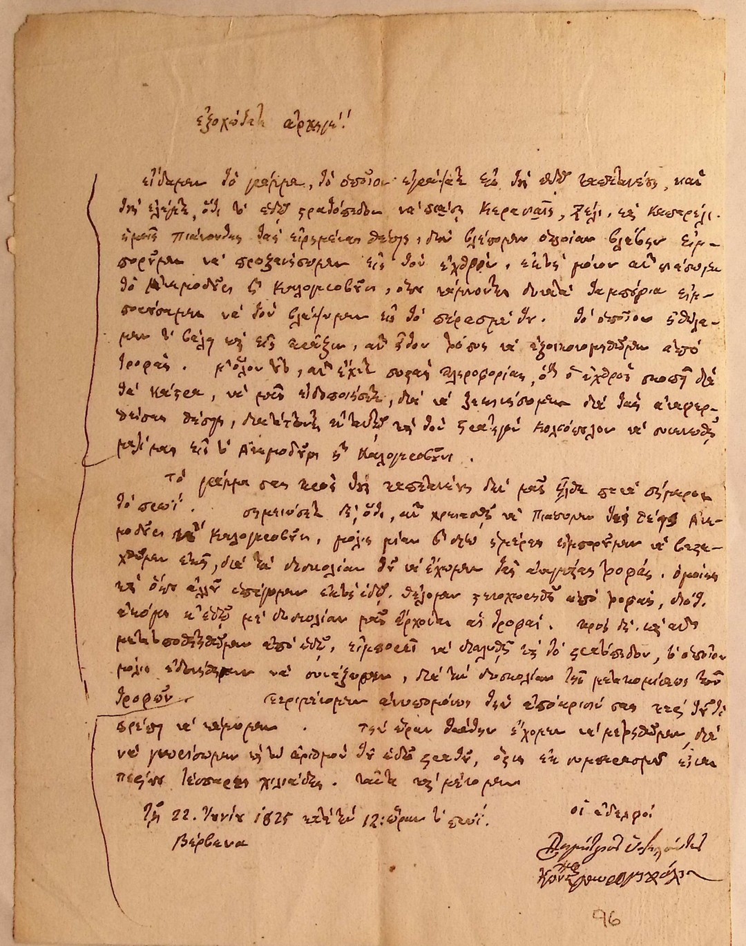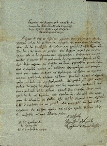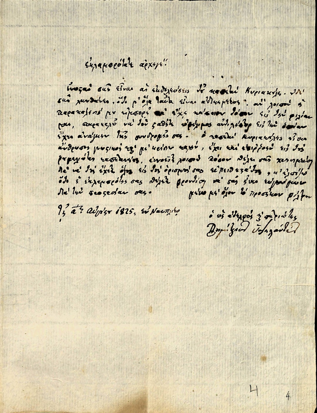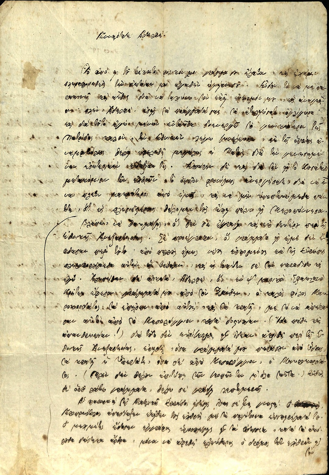 | Τίτλος | Επιστολή Δημήτριου Υψηλάντη και Κ. Μαυρομιχάλη προς Θεόδωρο Κολοκοτρώνη με πληροφορίες για κίνηση στρατευμάτων και αίτημα για νέες οδηγίες - διαταγές |