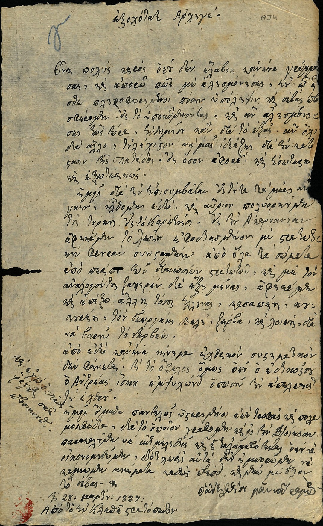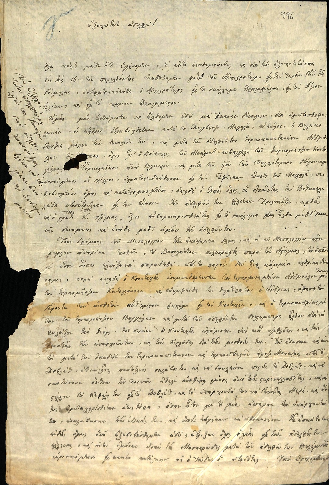 | Τίτλος | Επιστολη Γιαννη Ραγκου προς Θεοδωρο Κολοκοτρωνη - αναφορικα με κατασταση στη Ρουμελη και των προσκυνημενων οπλαρχηγων Ισκου κ.α που προσχωρησαν στον Κιουταχη. Επιπλεον αναφορα περι των κινησεων τους μετα του Αρχηστρατηγου Τσωρτς |