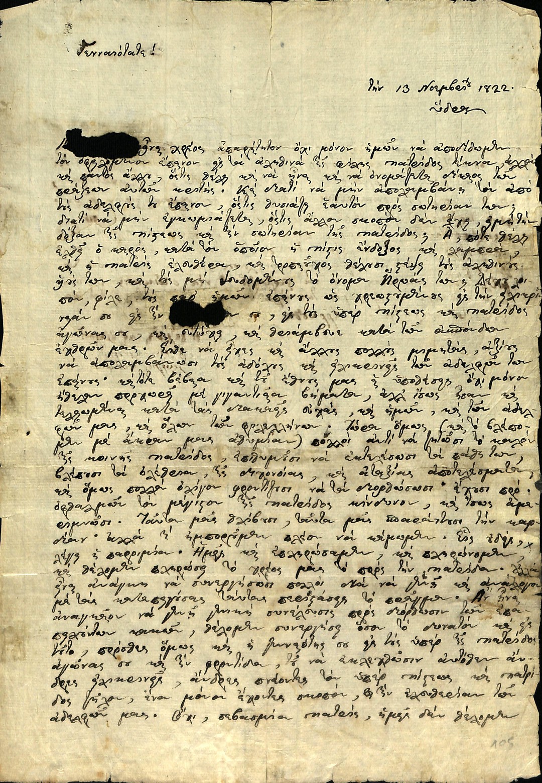 | Τίτλος | Επιστολή Υδραίων προς Νικήτα Σταματελόπουλο (Νικηταρά) λόγω αδυναμίας ανεφοδιασμού πολεμοφοδίων του στρατεύματος του. |