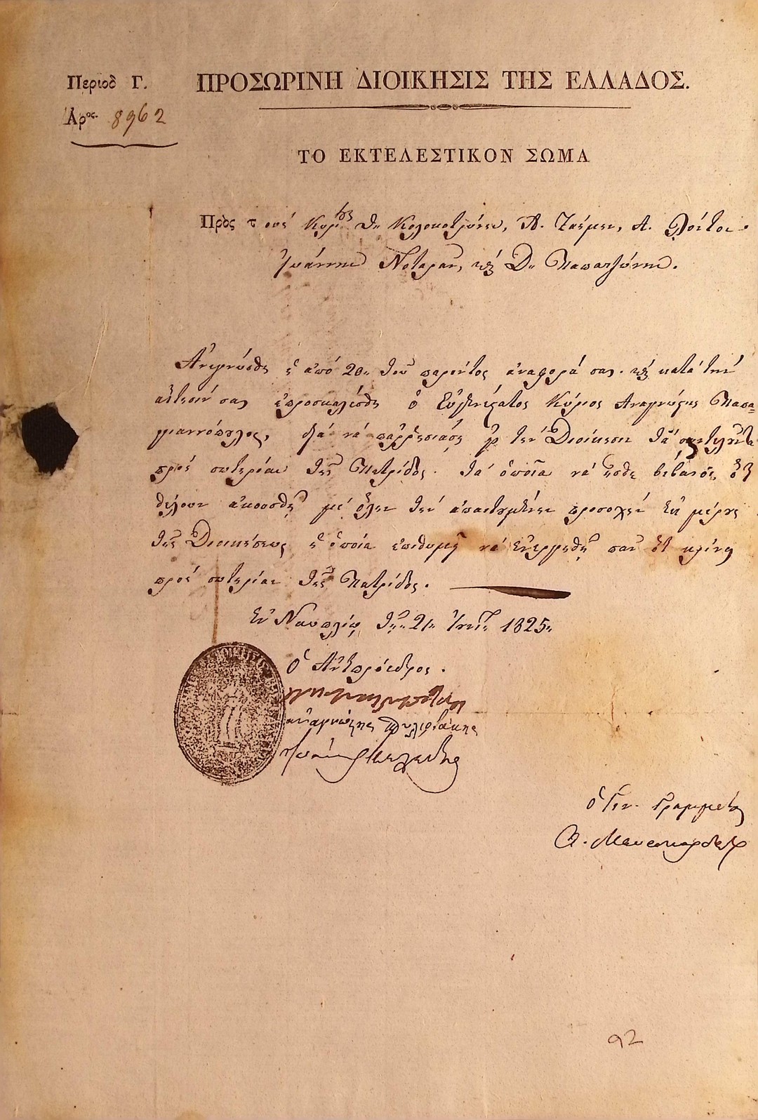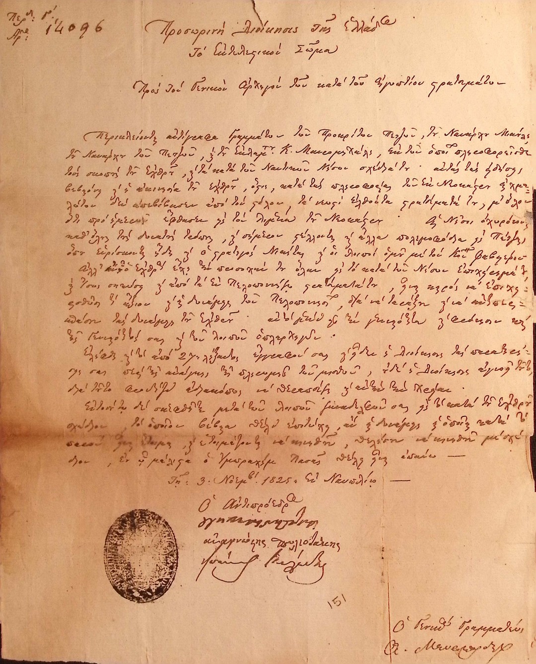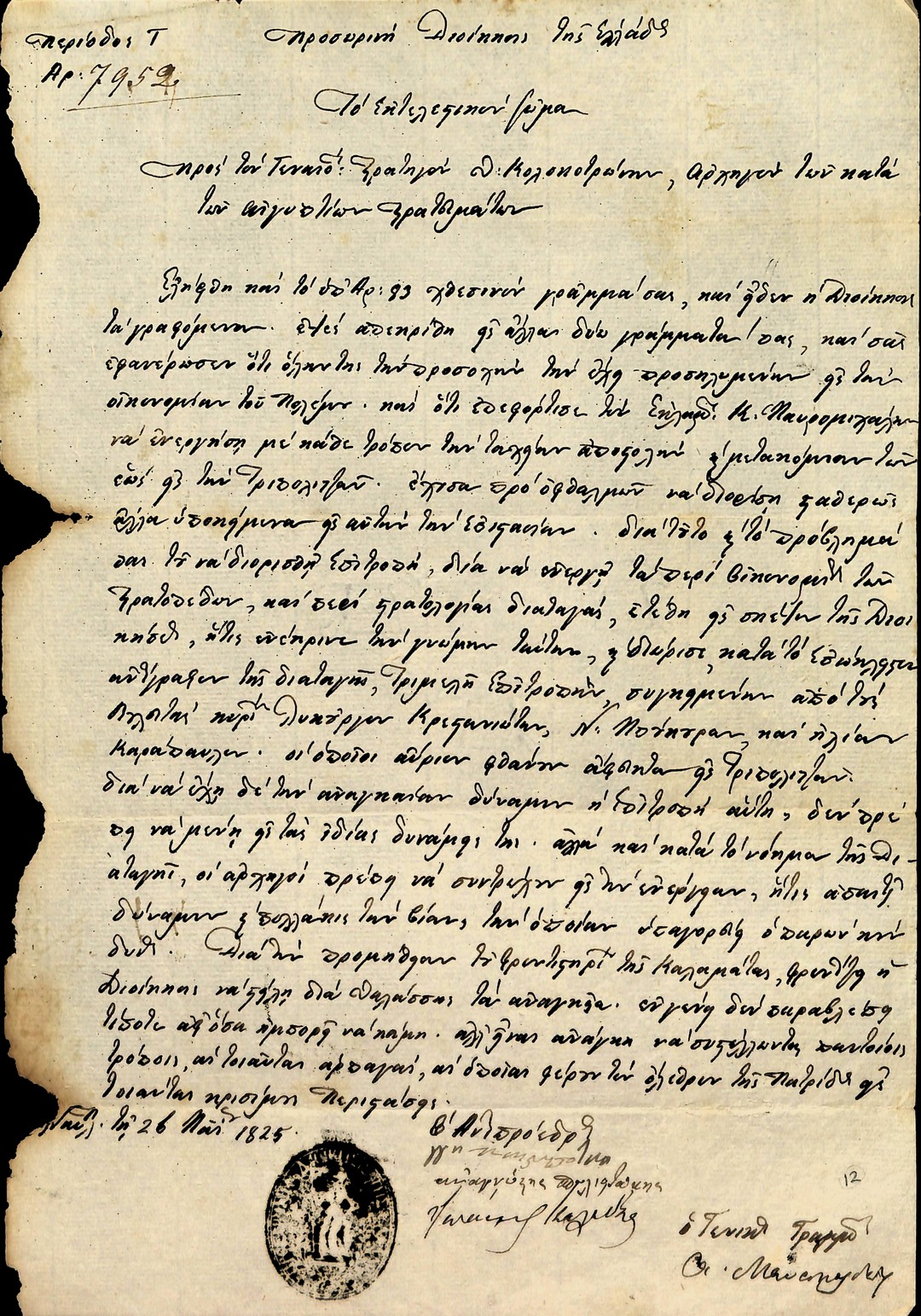 | Τίτλος | Επιστολή Π.Δ.Ε, του Εκτελεστικού προς Θεόδωρο Κολοκοτρώνη για την επέλαση του Ιμπραήμ και τις κινήσεις του εχθρικού στόλου από Σούδα να αποβιβαστεί στην Πελοπόννησο |