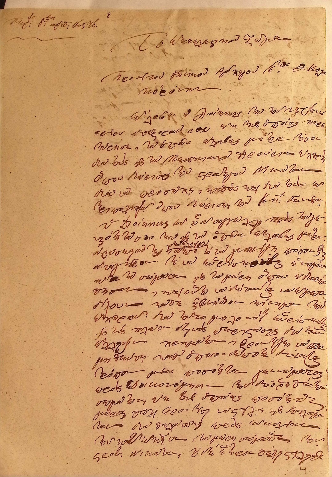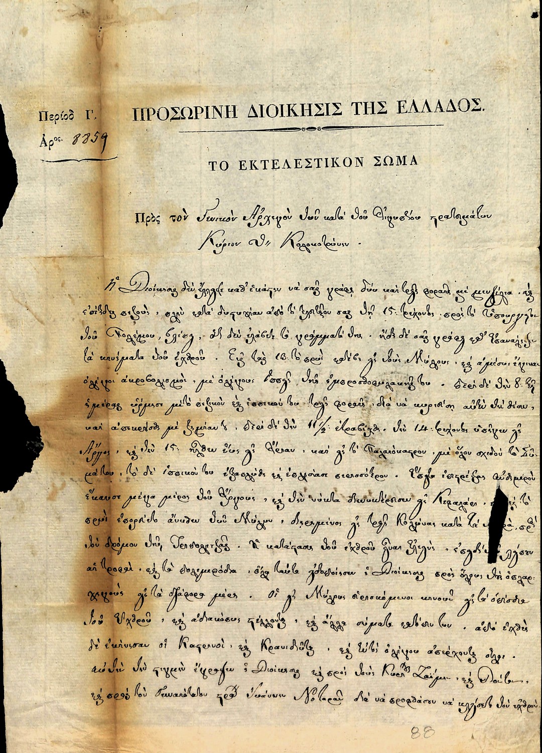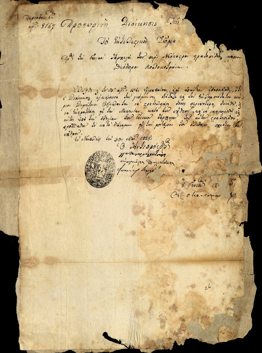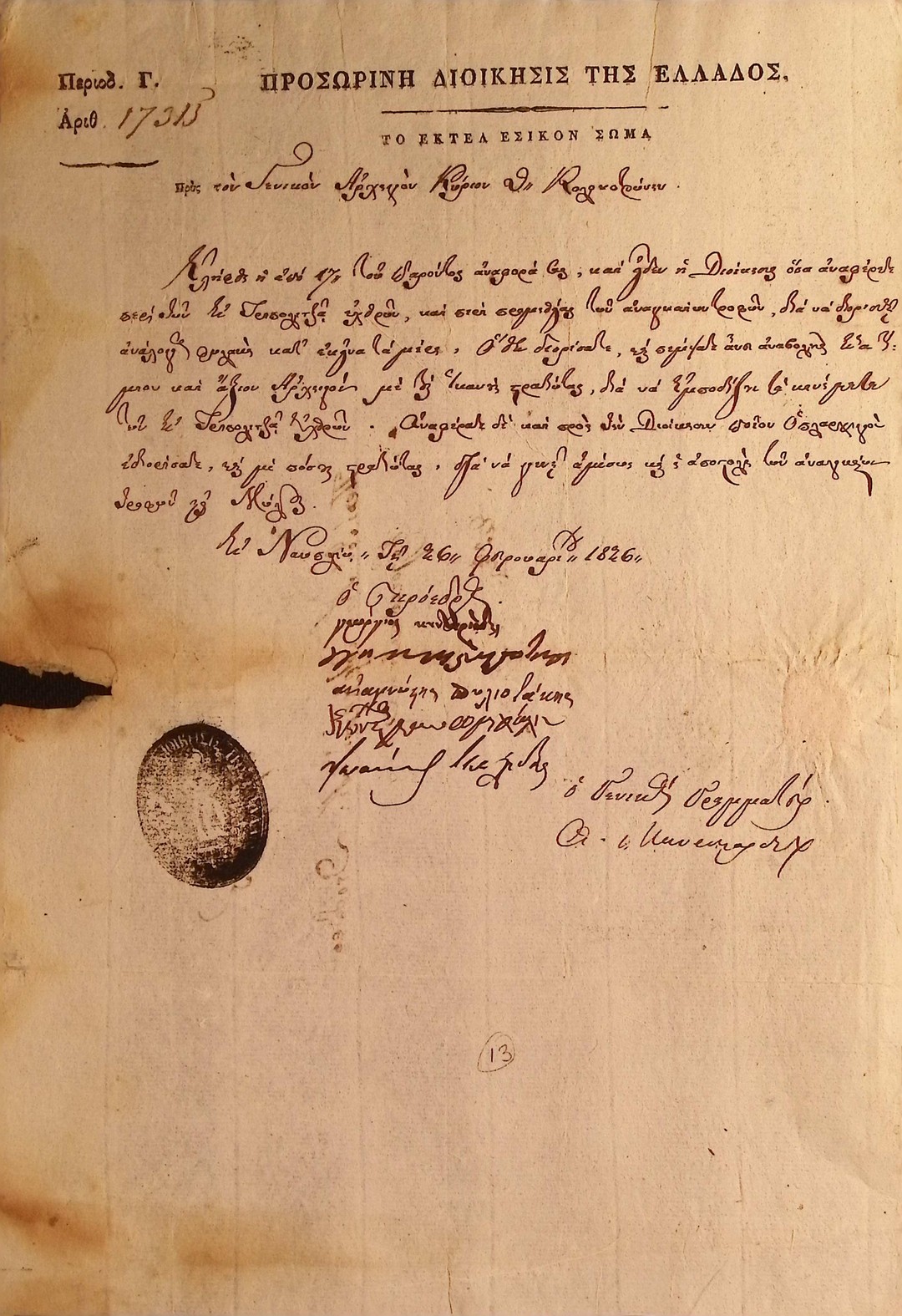 | Τίτλος | Επιστολή Π.Δ.Ε, του Εκτελεστικού προς Θεόδωρο Κολοκοτρώνη για την επέλαση του Ιμπραήμ και τις κινήσεις του εχθρικού στόλου από Σούδα να αποβιβαστεί στην Πελοπόννησο |