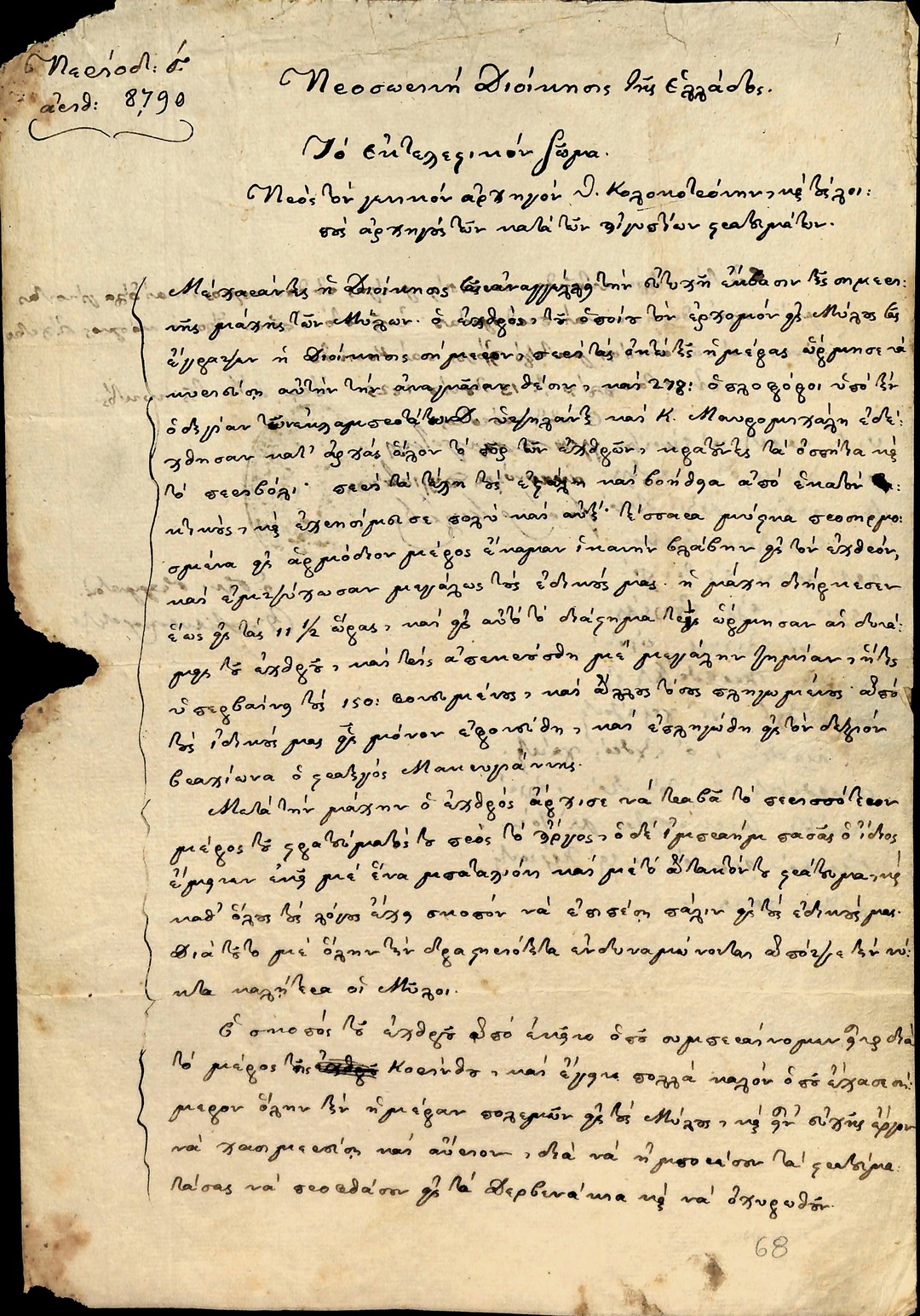 | Τίτλος | Επιστολή Π.Δ.Ε, του Εκτελεστικού προς Στρατηγό Θεόδωρο Κολοκοτρώνη με τα νεα της καταστροφής του Τουρκικού στόλου |