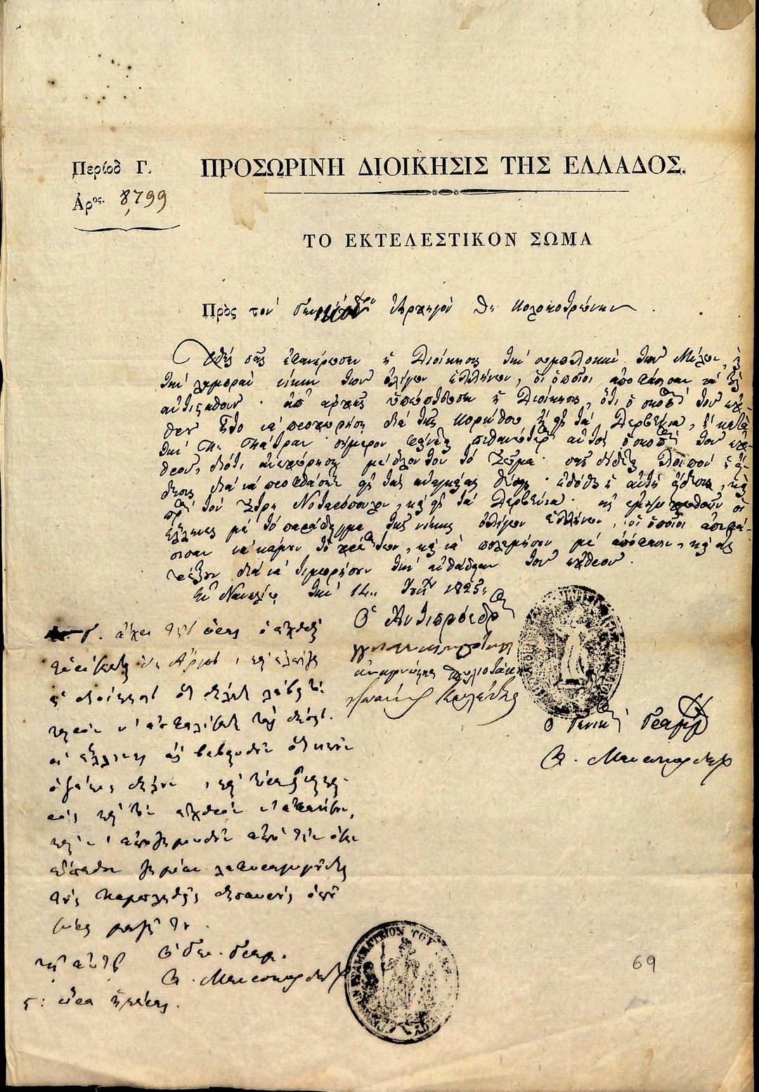 | Τίτλος | Επιστολη εκτελεστικου προς Θ.Κολοκοτρωνη σχετικα με πληρωμη στρατιωτων προς αποφυγη λιποταξιας και συσταση επιτροπης για τις αναγκες της Πελοποννησου. Επιπλεον ενημερωση σχετικα με αναχωρηση Γενναιου Κολοκοτρωνη και Κανελλου Δεληγιαννη με τα Ηπειρωτικα στρατευματα τα οποια για μην λιποτακτησουν πρεπρει να πληρωθουν. |
