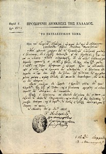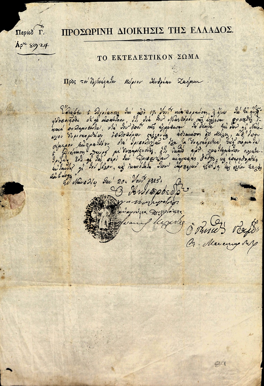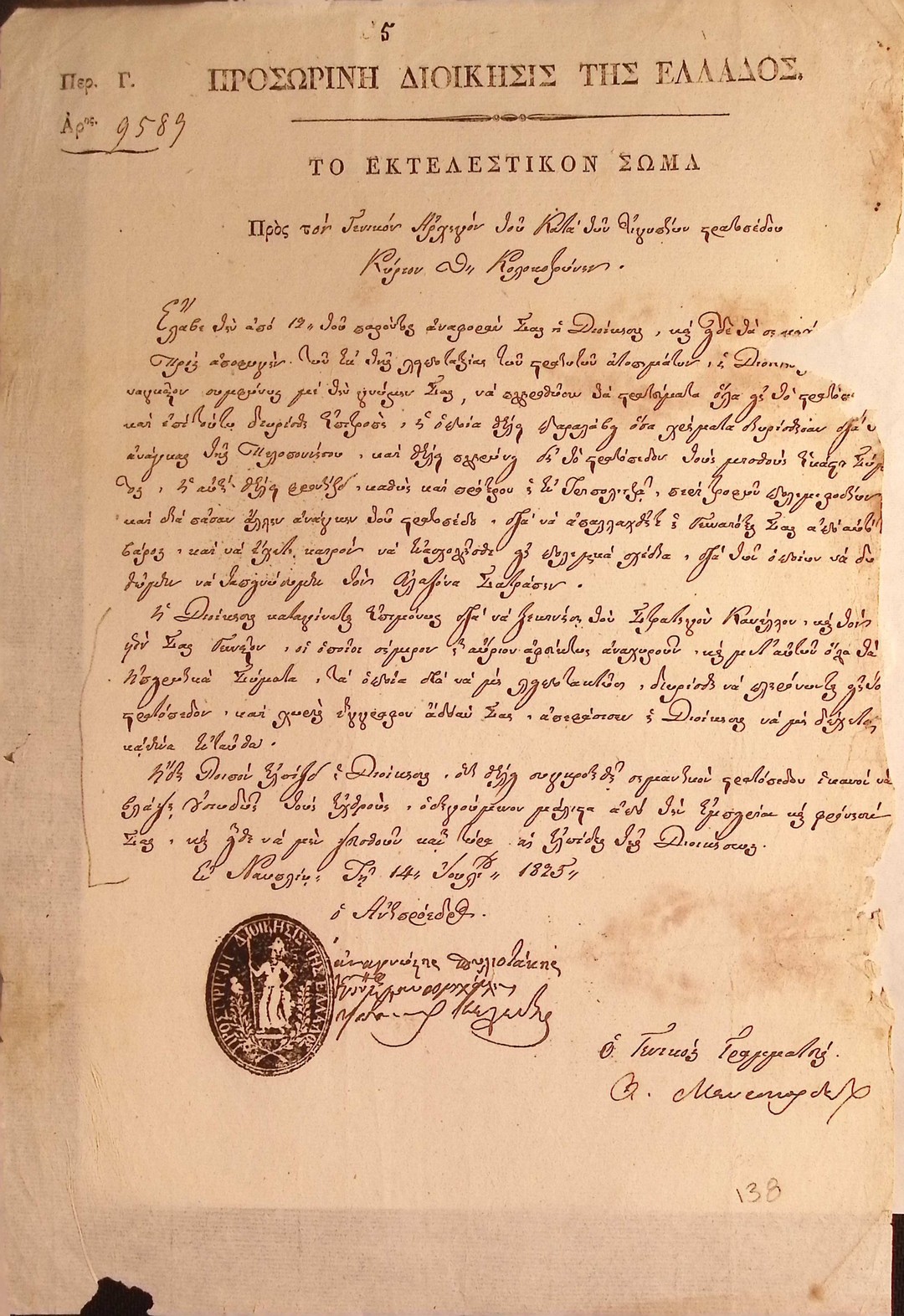 | Τίτλος | Επιστολή Π.Δ.Ε, του Εκτελεστικού προς Στρατηγό Θεόδωρο Κολοκοτρώνη για σύσταση επιτροπής για τα περί οικονομίας των στρατοπέδων |