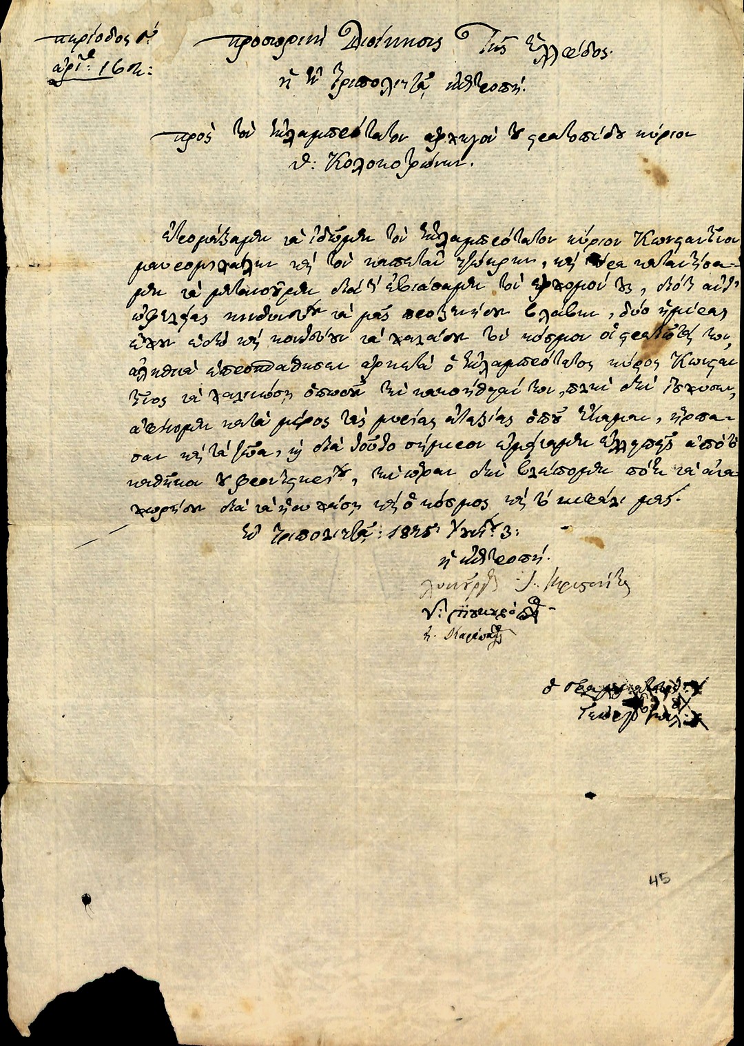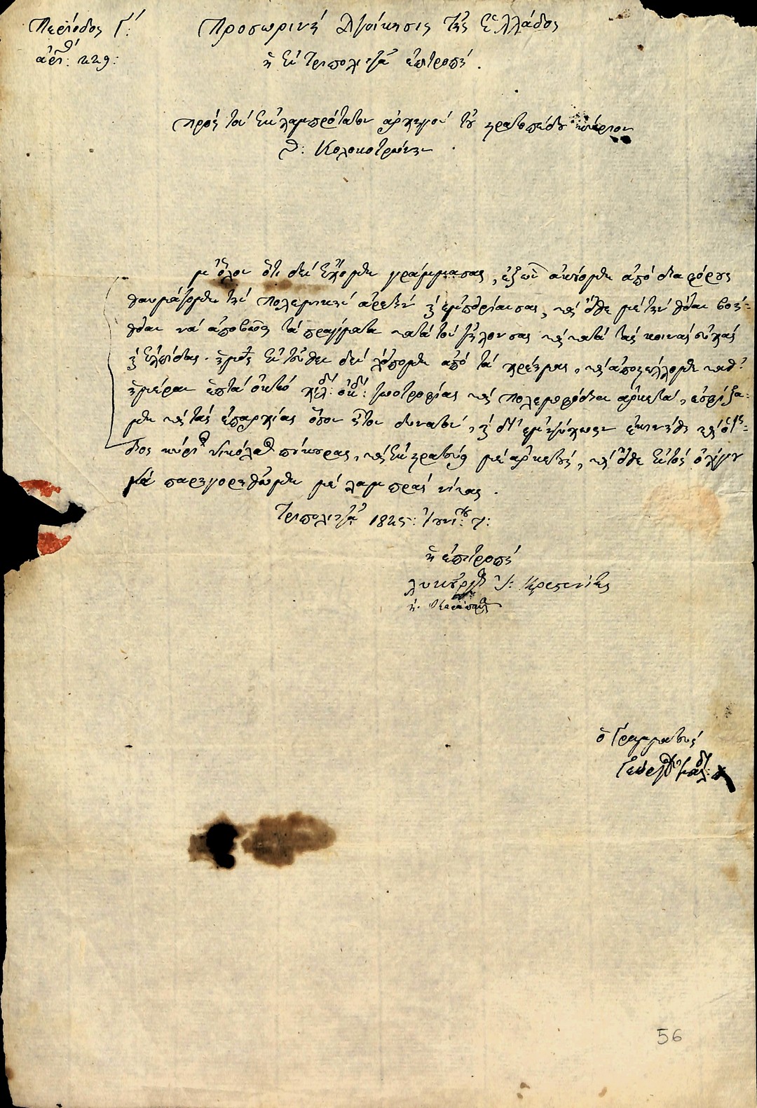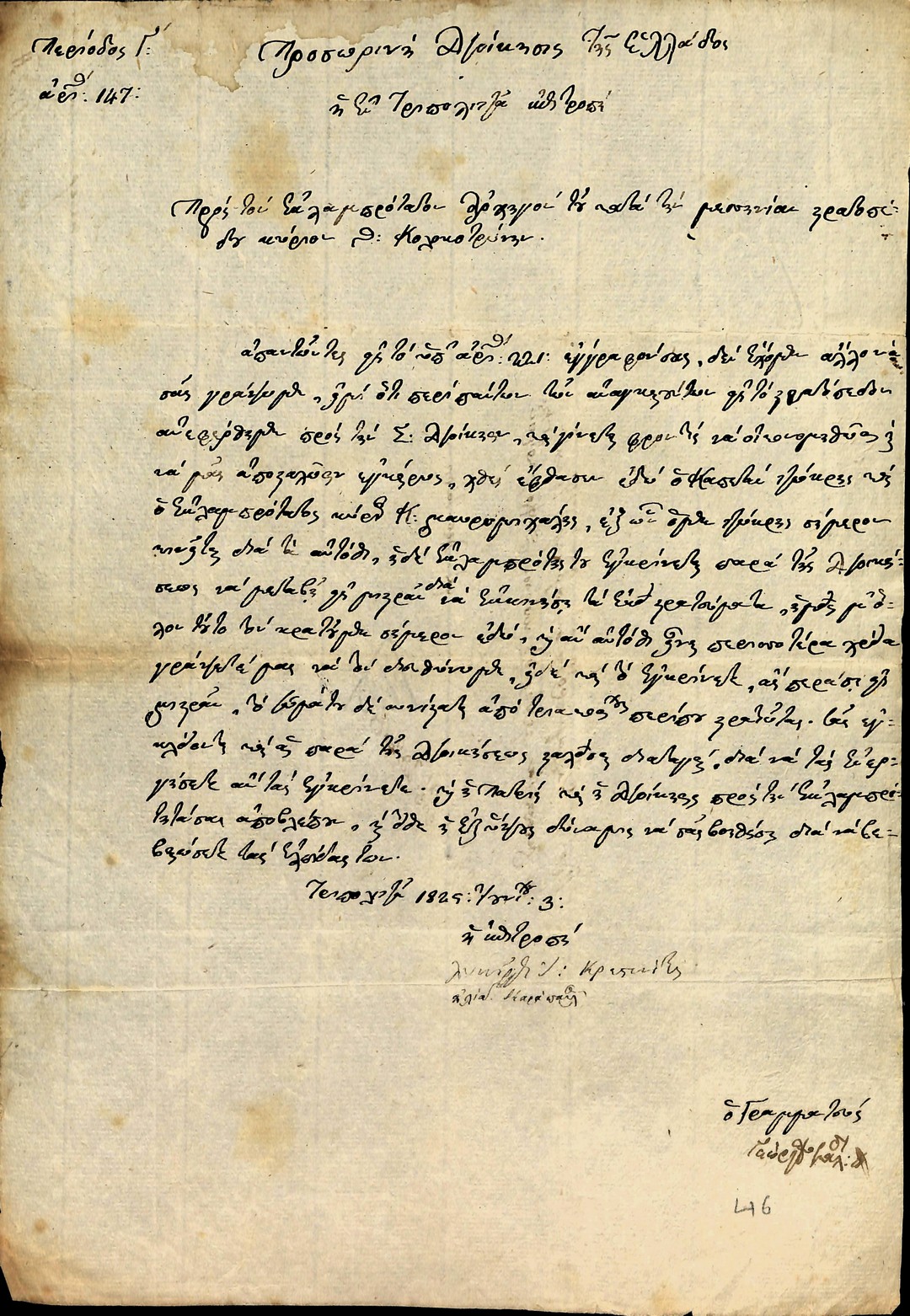 | Τίτλος | Επιστολή Π.Δ.Ε, της Επιτροπής Φροντιστών προς Στρατηγό Θεόδωρο Κολοκοτρώνη για την επίλυση του ζητήματος της αιχμαλωσίας των Γεώργιού Μαυρομιχάλη, Στρατηγού Γιατράκου κ.α |