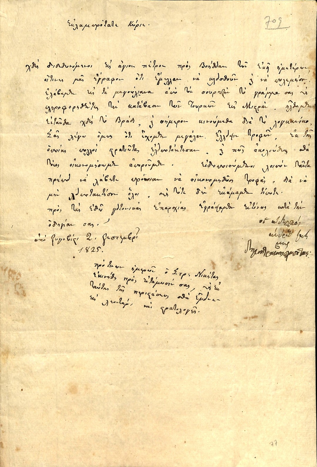 | Τίτλος | Επιστολή Π.Δ.Ε, του Υπουργού Πολέμου προς Στρατηγό Θεόδωρο Κολοκοτρώνη για ζητήματα του εφοδιασμού στρατοπέδου Νεοκάστρου |