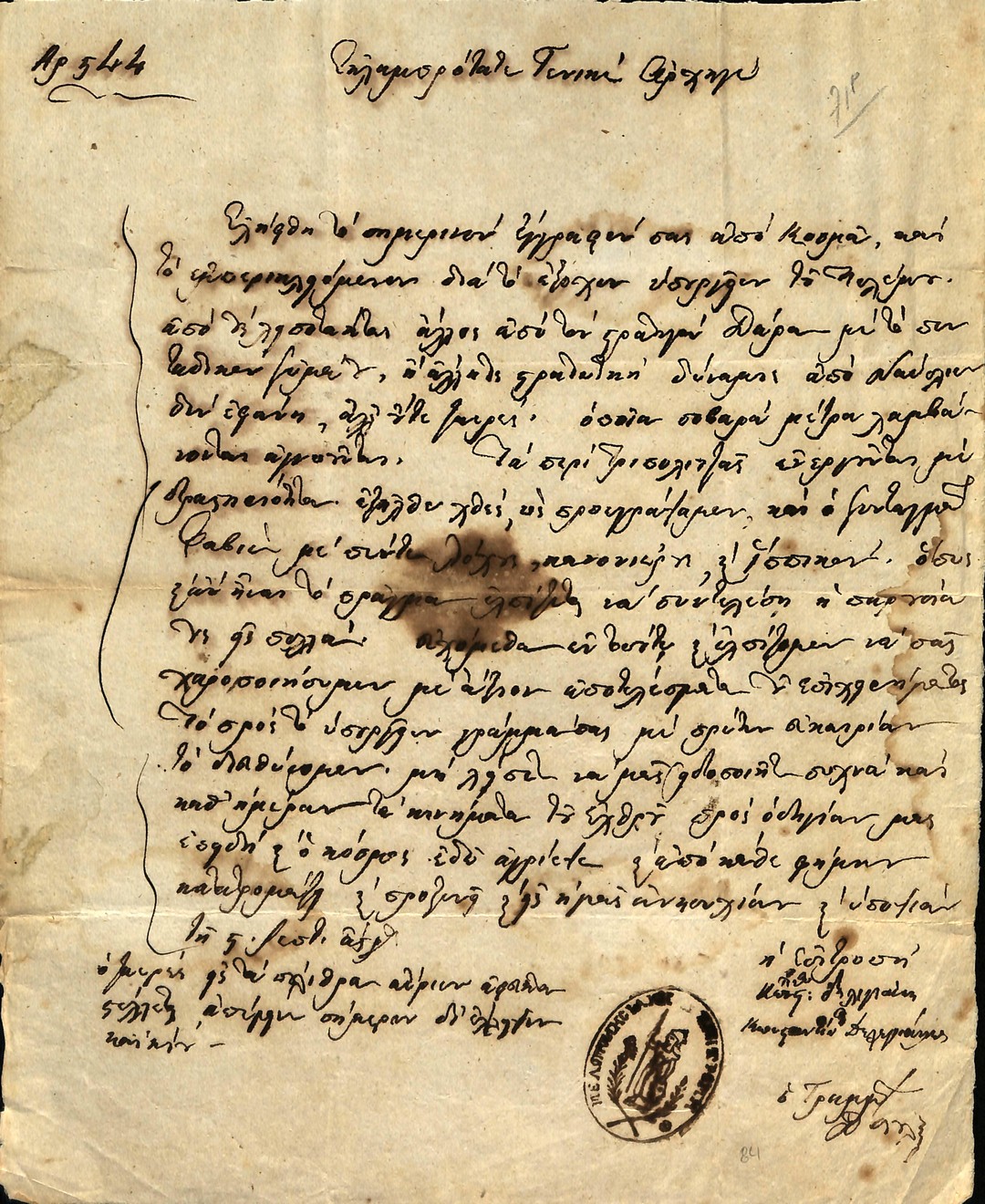 | Τίτλος | Επιστολη Εκτελεστικου προς Θεοδωρο Κολοκοτρωνη αναφορικα με επιθεση του εχθρου στο Μιστρα και εκκινησης στρατευματων προς ενισχυση του |